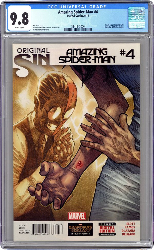 Ended Jan 29 2024 Winning Bid $171 1st full appearance of Silk (she had a cameo in #1). Original Sin Tie-In (Spider-Verse Prelude) - Written by Dan Slott. Art and Cover by Humberto Ramos. ORIGINAL SIN tie-in! The radioactive spider that gave Peter Parker his powers bit someone else, too! Who is Silk and where has she been? Don't miss this incredible new character who will be a major Spider-player for the whole year! 32 pages, full color. Cover price $3.99. Grade: CGC 9.8 explanation of grade Condition: Used (collectible)