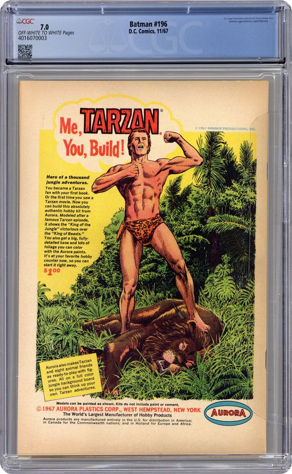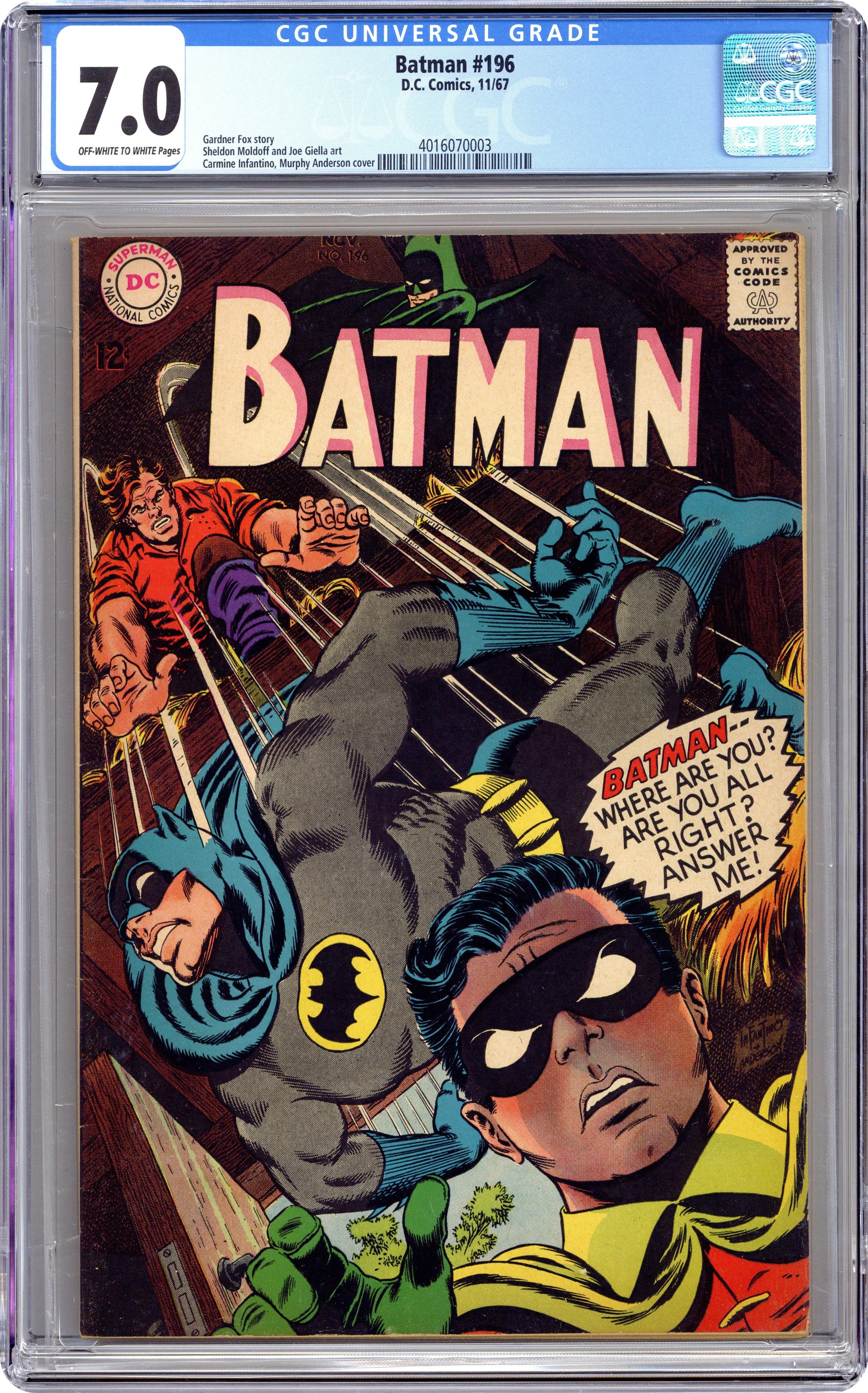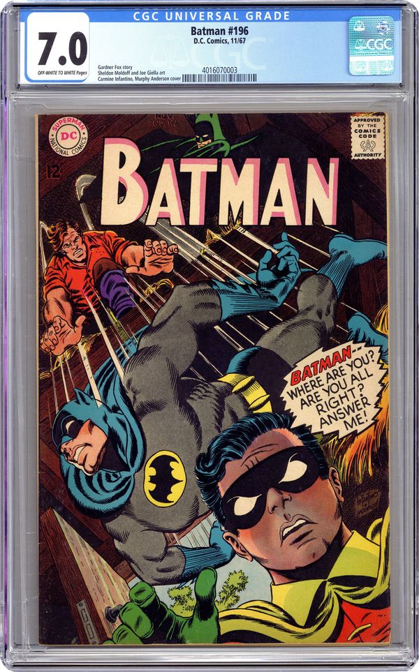 Ended Dec 20 2023 Winning Bid $50 Cover pencils by Carmine Infantino, inks by Murphy Anderson. "The Psychic Super-Sleuth!", script by Gardner Fox, pencils by Sheldon Moldoff (as Bob Kane), inks by Joe Giella; The Dynamic Duo team up with a person they believe to be a psychic detective, but soon learn that he is an imposter, and his men are holding the real Dubrov prisoner. Letter to the editor from letterhack Guy Lillian. "The Purloined Parchment Puzzle," script by Gardner Fox, pencils by Sheldon Moldoff (as Bob Kane), inks by Joe Giella; A large theft at a local bank, occuring in a locked room with only the guard present, seems to present itself as an open-and-shut case, but the Caped Crusader thinks otherwise...and proves it. 36 Pages, Full Color. Cover price $0.12. Grade: CGC 7.0 explanation of grade Condition: Used (collectible)