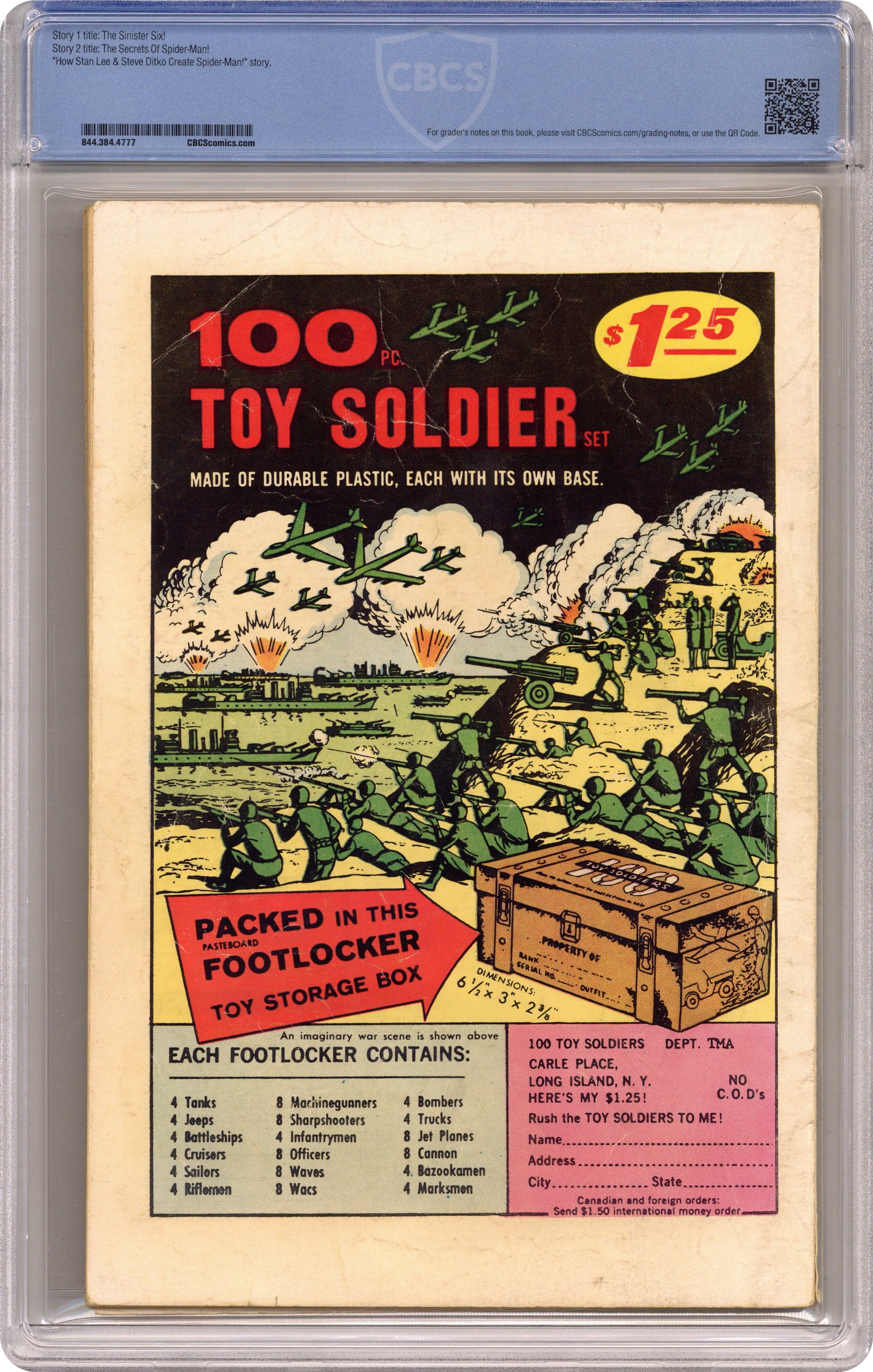 Cover art by Steve Ditko. First appearance of the Sinister Six (Doctor Octopus, Electro, Kraven the Hunter, Mysterio, Sandman, and the Vulture) in a new 41-page story, "The Sinister Six!" Script by Stan Lee, art by Steve Ditko; Dr. Octopus organizes the Sinister Six, composed of other Spider-Man Villains; They capture Betty Brant and Aunt May and force Spider-Man to rescue them. Cameos by the X-Men, the Fantastic Four, Captain America, Thor, Iron Man, Iron Man, Giant Man, and the Wasp. Lots of back-up features (all art by Ditko): 14 pages of pin-ups (Spider-Man's most famous foes); 9-page "The Secrets of Spider-Man"; 3-page "How Stan Lee and Steve Ditko Create Spider-Man!"; and other miscellaneous pin-ups. Giant 76-page issue! Most of this issue reprinted in Marvel Tales # 150. 76 pgs., full color. Cover price $0.25. Grade: CBCS 2.0 explanation of grade Condition: Used (collectible)