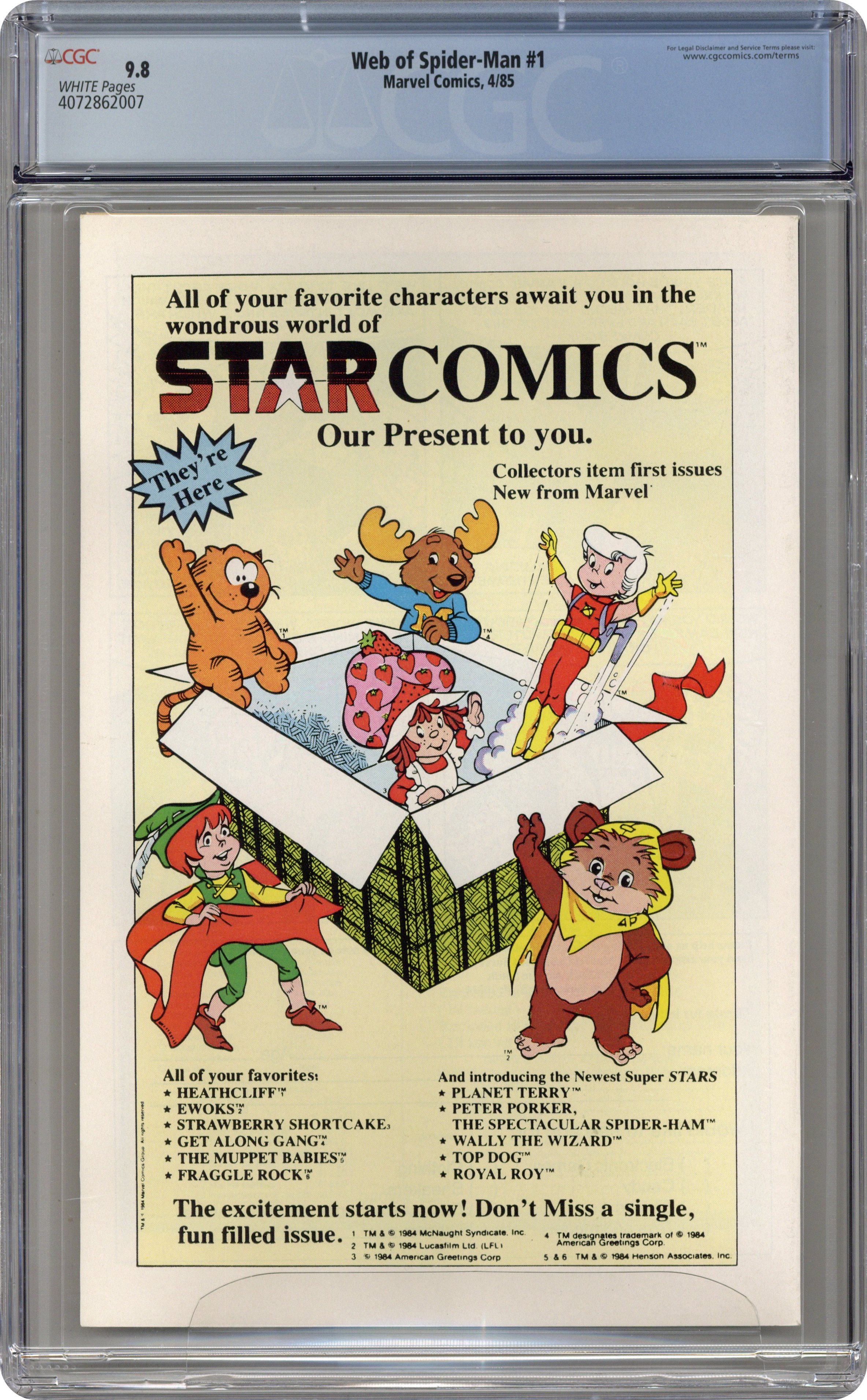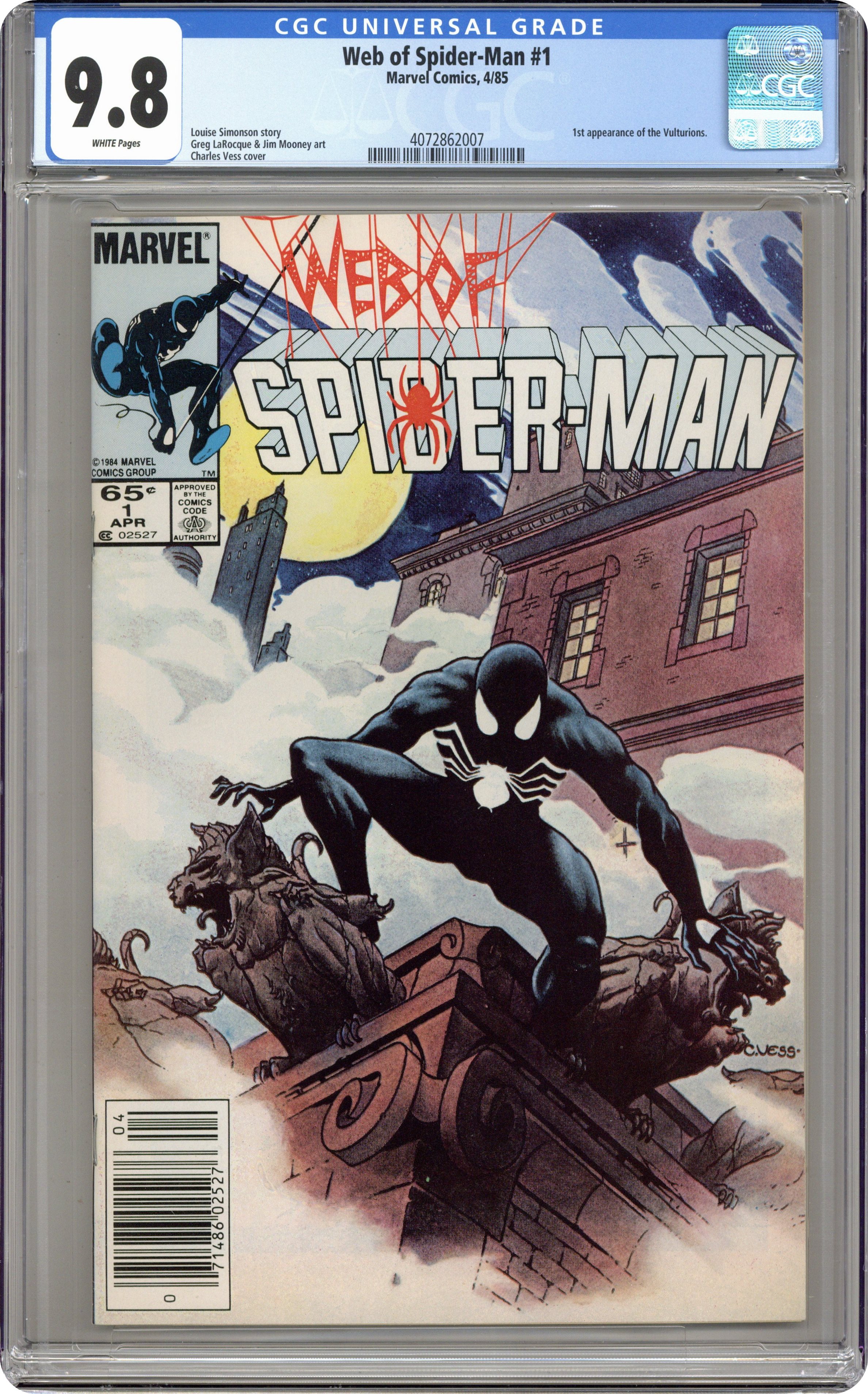 Newsstand Edition. "Til Death Do Us Part!" Story by Louise Simonson. Art by Greg LaRocque and Jim Mooney. Painted cover by Charles Vess. The alien symbiote (aka black costume) ambushes Peter Parker while he is getting dressed. Now Spider-Man must battle the black costume and the new Vulturions on his way to the Baxter Building! Meanwhile, Aunt May laments Peter's decision to drop out of graduate school. (Note: The Web of Spiderman series essentially replaced the Marvel Team-Up title as Marvel's third regular series featuring Spider-Man.) 32 pages Cover price $0.65. Grade: CGC 9.8 explanation of grade Condition: Used (collectible)