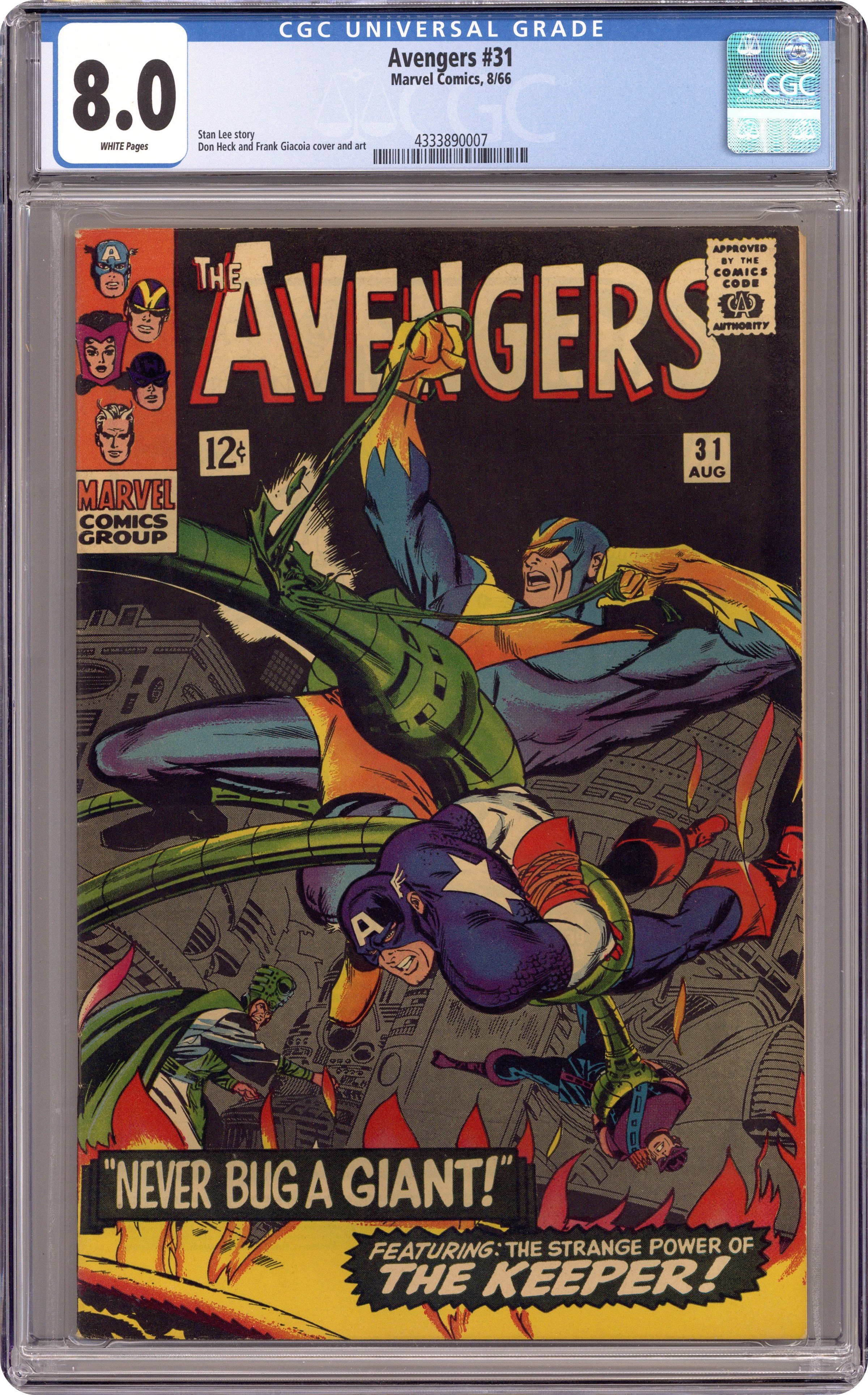 Ended Dec 20 2023 Winning Bid $80 Cover by Don Heck. "Never Bug a Giant!", script by Stan Lee, pencils by Don Heck, inks by Frank Giacoia; Captain America, The Wasp and Hawkeye leave for South America to help Goliath; Meanwhile, Quicksilver and the Scarlet Witch realise how badly they like being Avengers and hope their powers return soon; Goliath and Prince Rey escape to Prince Rey's rebel hideout; He explains how the Keeper controls a powerful cobalt flame, capable of destroying the world; Goliath realizes Prince Rey only wants the flame for his own desires and leaves him; Goliath attacks the Keeper and gets captured; The other Avengers attack and also get captured with the exception of the Wasp; Prince Rey's forces attack the Keeper's, while at the same time, the Wasp frees all the Avengers; Hawkeye smothers the flame with explosive arrows, destroying it. Avengers roll call: Captain America, Hawkeye, Goliath, the Wasp, and, briefly, Quicksilver,and the Scarlet Witch. Reprinted in Giant-Size Marvel Triple Action #1. 36 pgs., full color. $0.12. Cover price $0.12. Grade: CGC 8.0 explanation of grade Condition: Used (collectible)