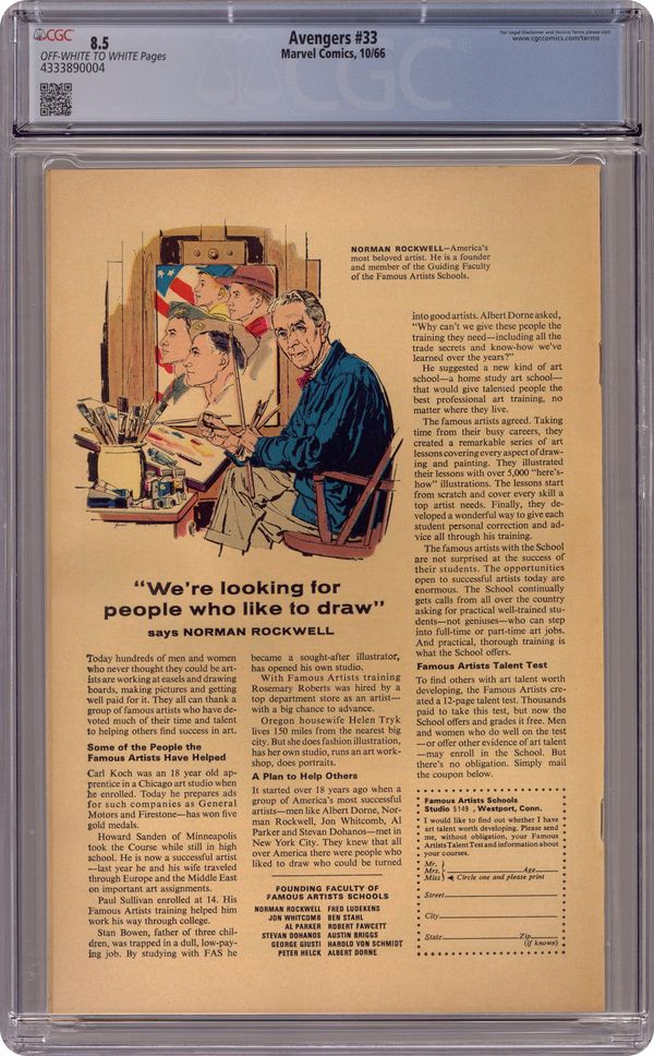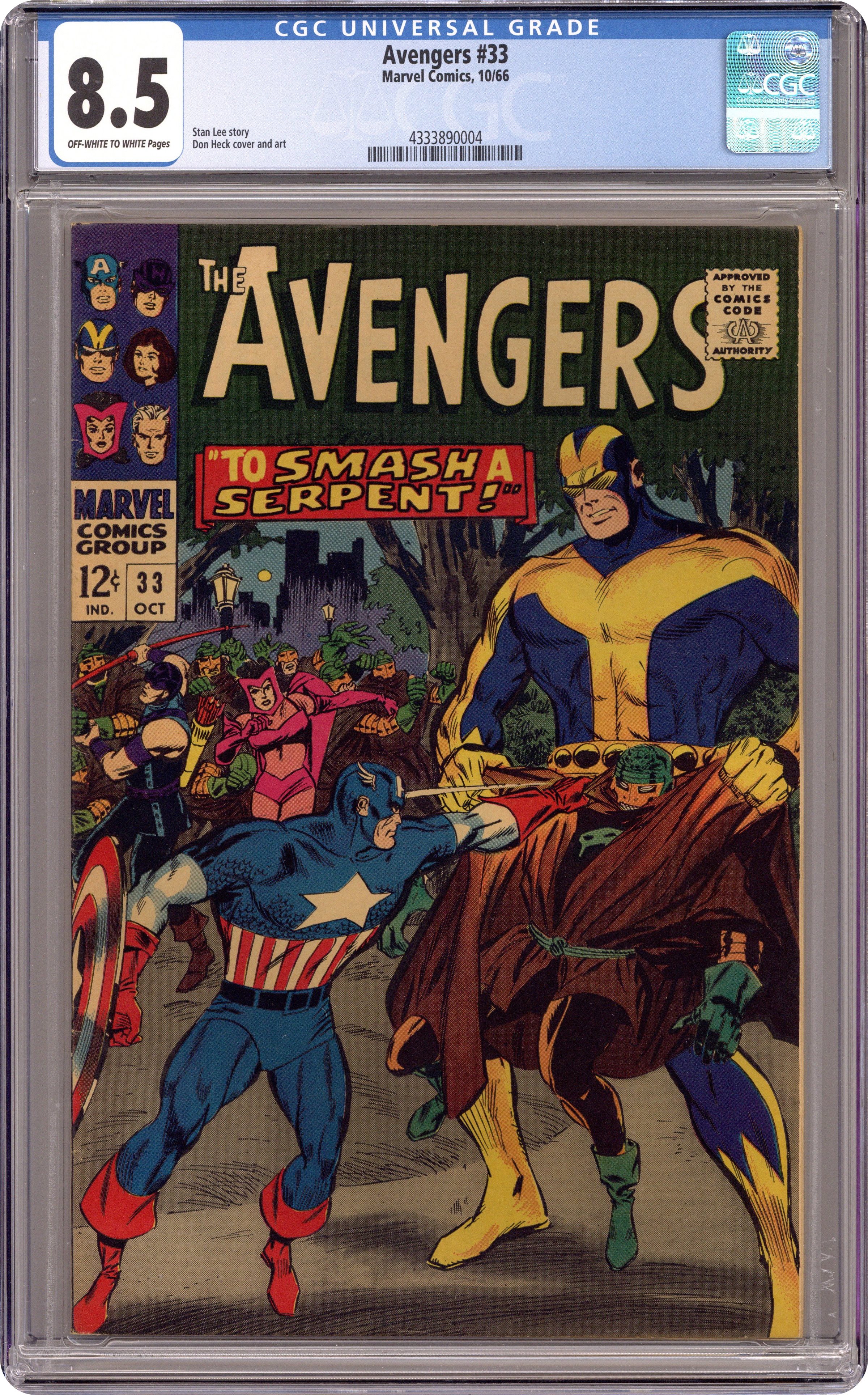 Ended Dec 20 2023 Winning Bid $75 Cover pencils by Don Heck and Jack Kirby (alterations), inks by Don Heck. "To Smash a Serpent," script by Stan Lee, art by Don Heck; With Captain America hostage, the Avengers can't attack the serpents; Bill Foster walks out on Goliath, because of this; Captain America seems to have been brainwashed by the Sons, turning him into a fascist; The Avengers attend a Sons of the Serpent meeting while Hawkeye and the Black Widow attempt a rescue mission to save Captain America; During the meeting, Goliath argues with the Sons of the Serpent, but is attacked by a brainwashed Captain America; After a brief battle, Goliath follows the escaping Serpents to their ship; Black Widow finds the real Captain America captive and rescues him. Avengers roll call: Captain America, Hawkeye, Goliath, and the Wasp. Reprinted in Marvel Triple Action #25. Letter from artist Peter von Sholly. 36 pgs., full color. $0.12. Cover price $0.12. Grade: CGC 8.5 explanation of grade Condition: Used (collectible)