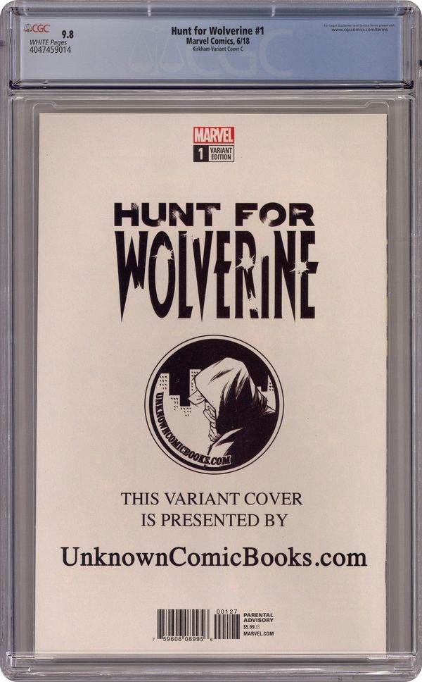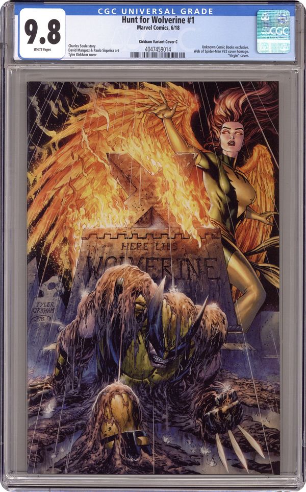Unknown Comics exclusive virgin cover by Tyler Kirkham. Written by Charles Soule. Art by David Marquez and Paulo Siqueira. The RETURN OF WOLVERINE begins here, providing the first piece of a mystery that will leave no corner of the Marvel Universe untouched. Just as the X-Men have finally come to terms with Logan's death, they learn a terrible secret. Old wounds will be re-opened, truths questioned, and an epic quest begun. The earliest clues to the mystery of Wolverine's return are laid down here... who will solve it first? 52 pages, full color. Rated T+ Cover price $5.99. Grade: CGC 9.8 explanation of grade Condition: Used (collectible)