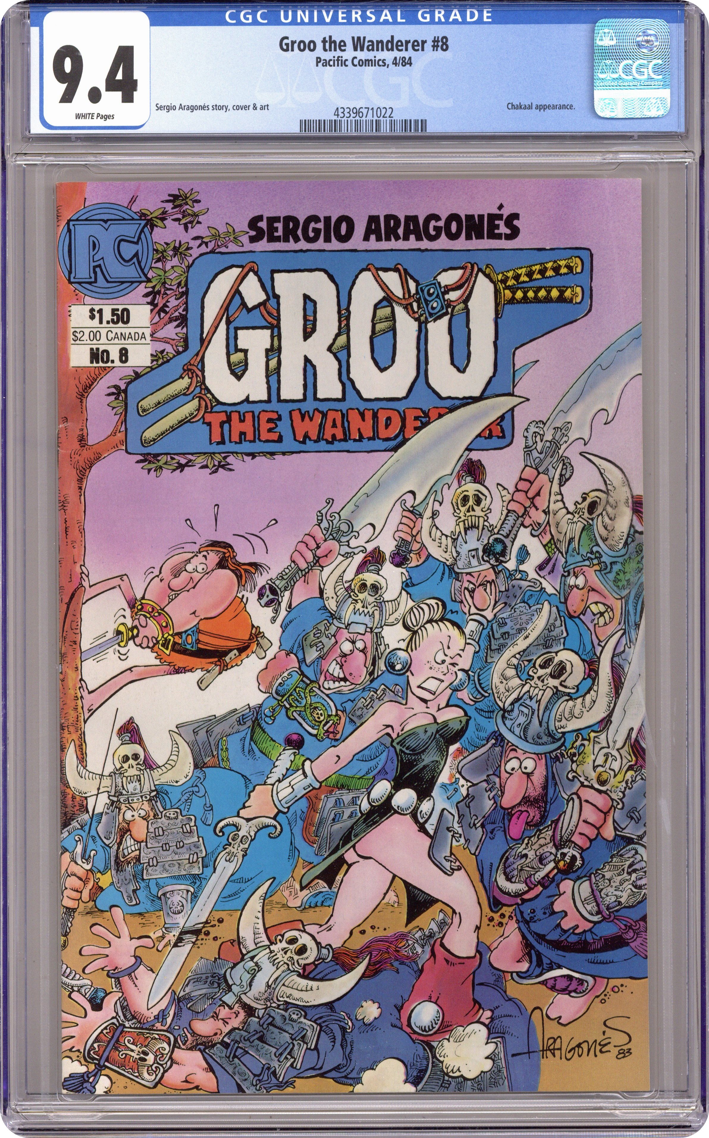 Warriors Two. Story by Mark Evanier and Sergio Aragones. Art and cover by Sergio Aragones. Sword and sorcery comedy from Sergio Aragones, as Groo's skill with the sword combines with his stupidity to make him dangerous to friend and foe alike. Groo once again meets the beautiful female warrior Chakaal and dreams of wooing her, but she's just concerned with defeating a moving fortress without getting killed. Final issue of the series; followed by Groo Special (1984) #1. 32 pages, Full Color. Cover price $1.00. Grade: CGC 9.4 explanation of grade Condition: Used (collectible)