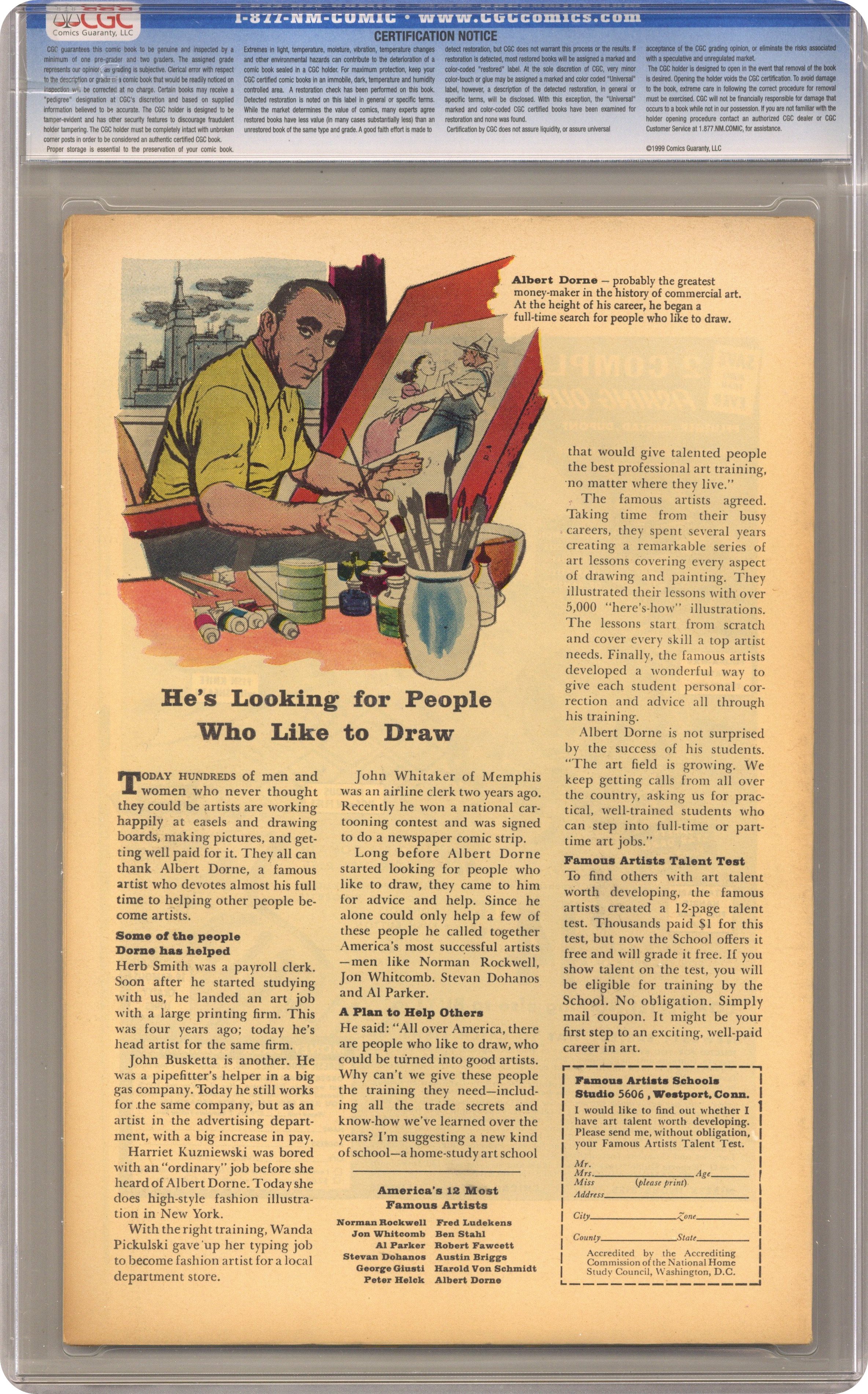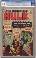Cover pencils by Jack Kirby, inks by Steve Ditko. First appearance of the green Hulk and the Toad Men in "The Terror of the Toad Men," script by Stan Lee, pencils by Jack Kirby, inks by Steve Ditko; The Toad Men are above Earth, in search of its brightest scientist; Rick and Bruce explore an underground cave where they hope to imprison Hulk each night; The Toad men capture Bruce Banner and bring him to their spaceship; Bruce Banner is found in a Toad Men crashed spaceship while their fleet arrives on Earth; Hulk escapes from his cell while General Ross forget about the Toad Men. Fantastic Four ad. 36 pgs., full color. $0.12. Cover price $0.12. Grade: CGC 5.0 explanation of grade Condition: Used (collectible)