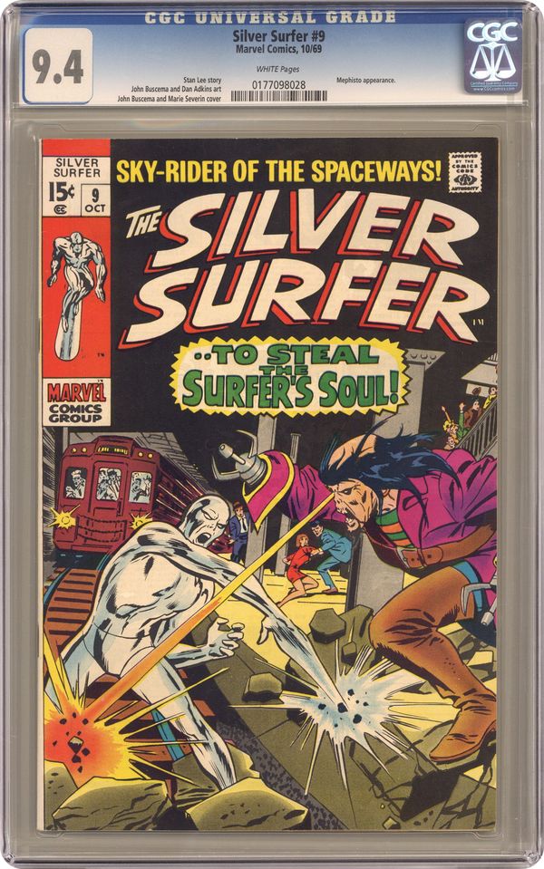 "...To Steal the Soul of the Silver Surfer!" Part 2 of 2. Written by Stan Lee. Art by John Buscema and Dan Adkins. The embodiment of evil in the Marvel Universe, Mephisto, has sent a powerful force for evil to bring him the soul of the Silver Surfer. Cover price $0.15. Grade: CGC 9.4 explanation of grade Condition: Used (collectible)