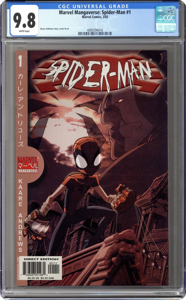 cover by kaare andrews kaare andrews (w & p) ? THE SCOOP: It's non-stop ninja action in the Manic Mangaverse Manner! ? THE STORY: Teenage ninja Peter Parker has had to deal with a lot of stress in his life, but nothing could have possibly prepared him for this ? his most trying test to date! Will the training he received from Uncle Ben be enough to avenge his Sensei's death? ? THE CREATORS: Written and penciled by AMAZING SPIDER-MAN cover artist, Kaare Andrews (Gen 13)! ? THE FORMAT: 32 pages, with ads. 7-59606-tbd-00111 2.25 Cover price $2.25. Grade: CGC 9.8 explanation of grade Condition: Used (collectible)