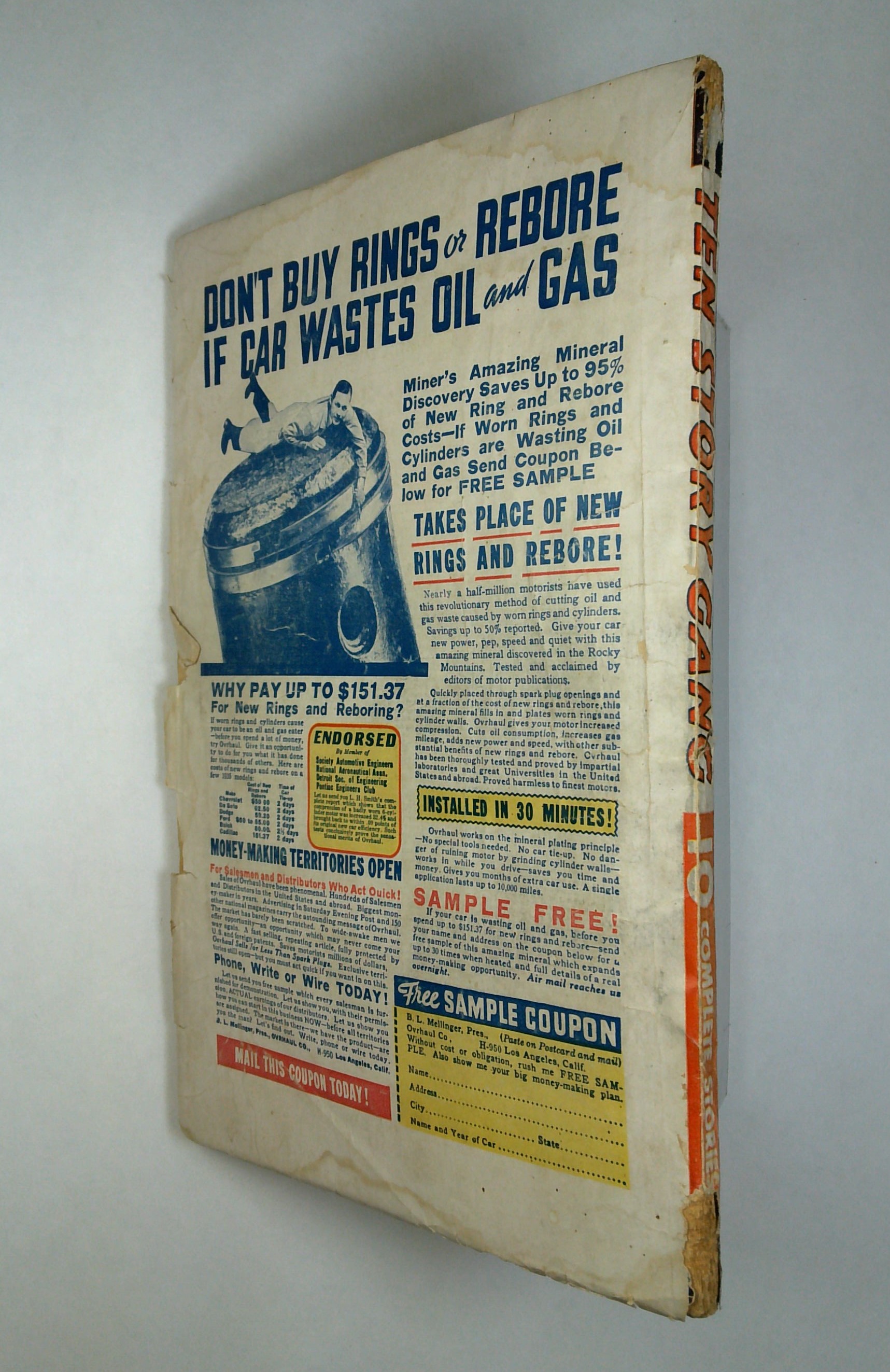 - Front cover detached 10%. Back cover detached 10%. Water damage: Extensive. Staple rust: Moderate.