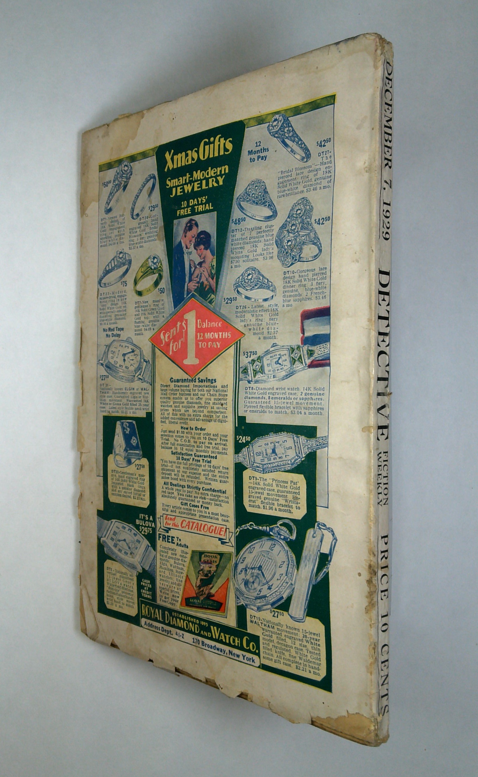 - Front cover detached 5%. Back cover detached 10%. Water damage: Extensive. Staple rust: Slight.