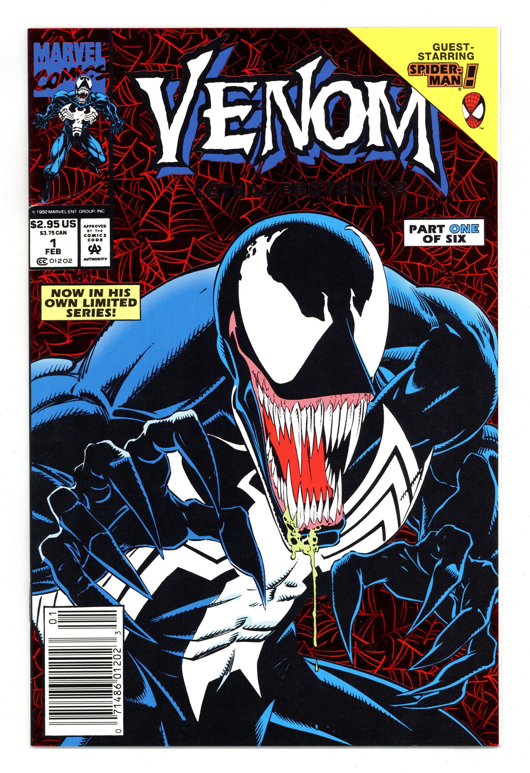 Ended Apr 10 2024 Winning Bid $18 Newsstand Edition. Red Foil Enhanced CardStock cover, art by Mark Bagley and Sam de la Rosa. Lethal Protector Part 1: Dark Soul Drifting, script by David Michelinie, pencils by Mark Bagley, inks by Al Milgrom and Sam de la Rosa; Venom moves to San Fransisco to try out his new protection of innocents racket; Venom and Spidey save a group of homeless folk. 36 pgs., full color. $2.95. Cover price $2.95. Grade: VG/FN 5.0 explanation of grade Condition: Used (collectible)