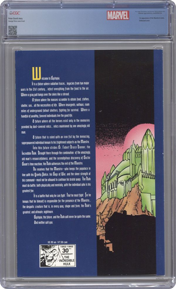 Starts Dec 8 Future Imperfect: Part 1 of 2 - Written by Peter David. Art and Cover by George Perez. This two-issue bookshelf comic features an embossed cover! The green behemoth is whisked away to an alternate timeline where he's the only protection against the Maestro, his alternate future persona! First appearance of the Maestro. Also featuring Rick Jones and Janis (Rick Jones' great granddaughter). Softcover, 48 pages, full color. Cover price $5.95. Grade: CGC 9.6 explanation of grade Condition: Used (collectible)