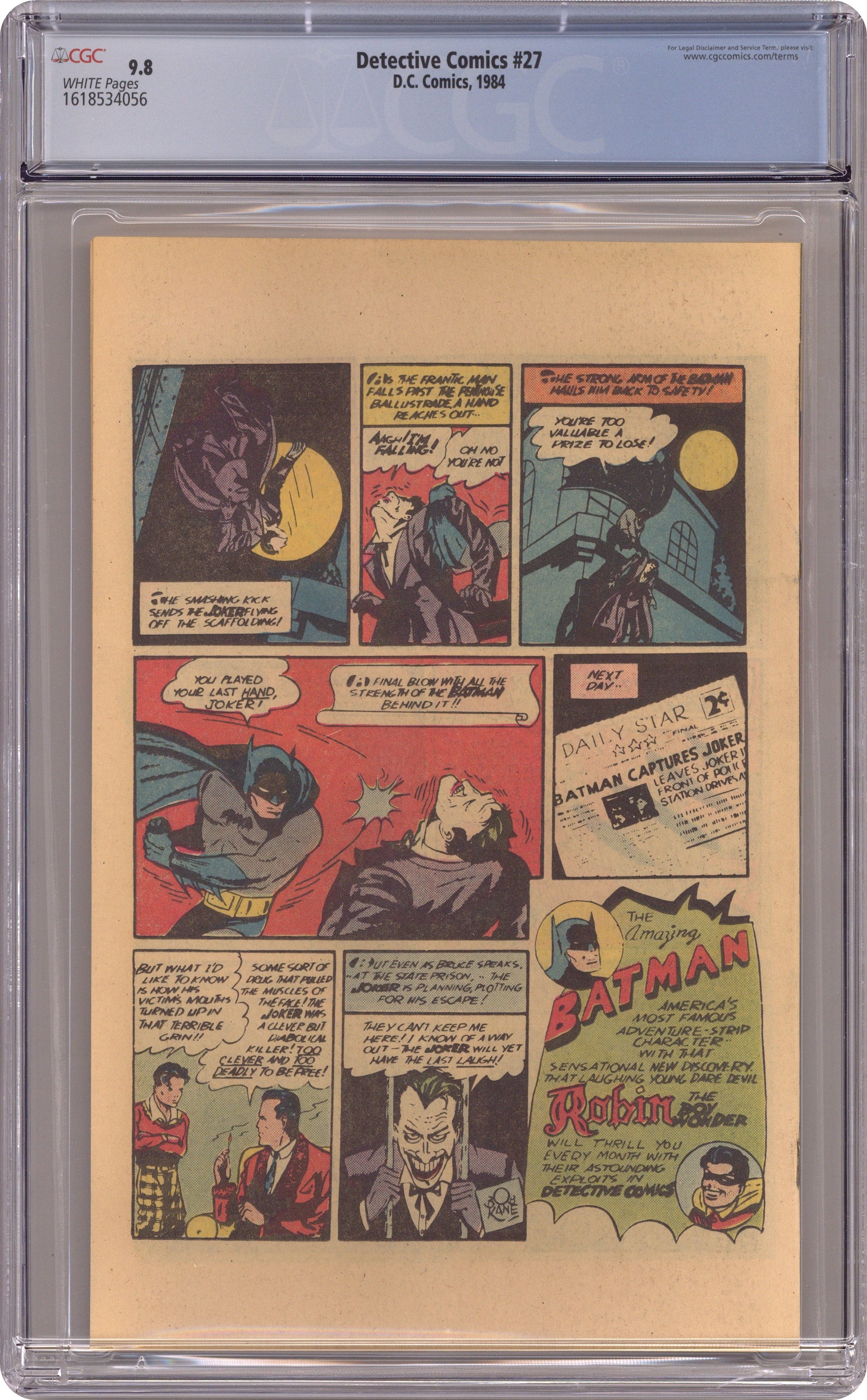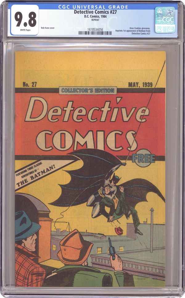 Oreo Cookie promotional comic from 1984. Reprints Batman cover and story from Detective #27, plus Robin origin from Detective #38, and first Joker appearance from Batman #1. 32-pages, all newsprint, full-color standard comic book size. Grade: CGC 9.8 explanation of grade Condition: Used (collectible)