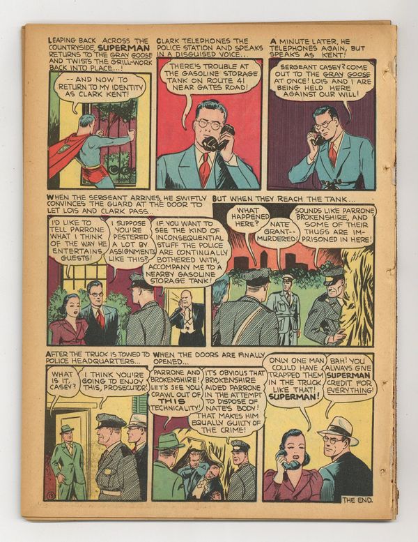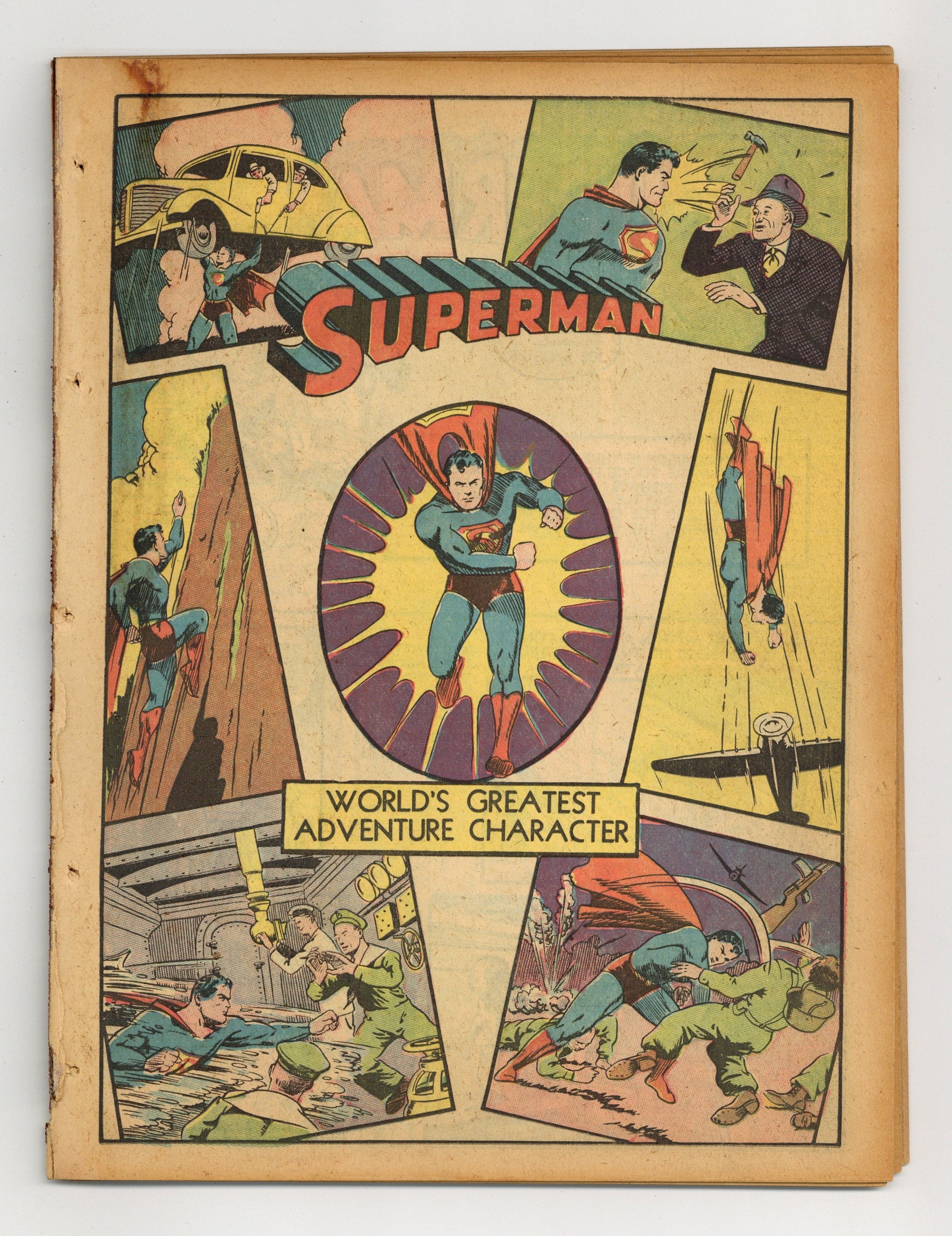 Cover art by Wayne Boring. Untitled Superman story, script by Jerry Siegel, art by Paul Cassidy [as Joe Shuster]; Two hard working professors succeed in creating a process to enlarge the size of living organisms, but when they choose to try the process on human beings, and succeed with dreadful results, the Man of Steel must intervene. Supermen of America club info. Untitled Superman story, script by Jerry Siegel, pencils by Wayne Boring [as Joe Shuster]; Warned by a friend of his of 5th Columnists landing by boat in the city of Metropolis, Clark Kent, as Superman, investigates and discovers that they are planting skilled workmen as spies and saboteurs with American armament factories, as well as having a secret base in a mountainous valley. Superman Licensed Products ad. Untitled Superman story, script by Jerry Siegel, art by Paul Cassidy [as Joe Shuster]; After Clark is fleeced at a local carnival, Lois is given permission by the editor of the Planet to get evidence of the crookedness of the games there. Batman #3 ad, art by Bob Kane. Knotty Problem text story by Ed Carlisle. Untitled Superman story, script by Jerry Siegel (signed), pencils by Joe Shuster and Wayne Boring [as Shuster], inks by Boring [as Shuster]; Lois and Clark attempt to get the low down on thefts of morphine. 68 Pages, Full Color. Cover price $0.10. Grade: Coverless explanation of grade Condition: Used (collectible)