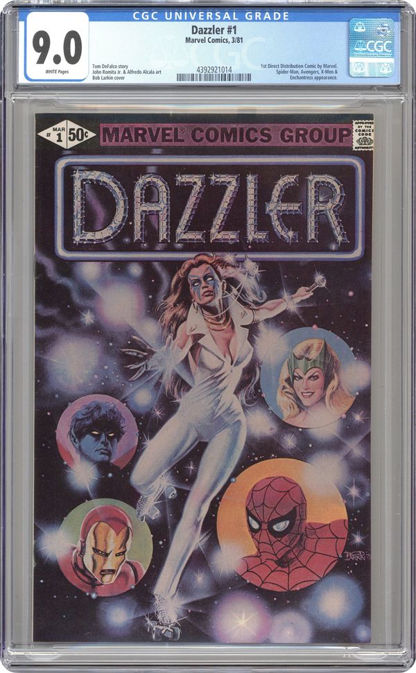 Corrected version with pages 24 & 25 printed in color. Dazzler origin in "So Bright This Star." Script by Tom DeFalco, pencils by John Romite Jr., inks by Alfredo Alcala. Guest appearances by Spider-Man, the X-Men (Storm, Wolverine, Colossus, Nightcrawler, and Sprite), the Avengers (Hawkeye, the Beast, Iron Man, the Wasp, and Captain America), and the Enchantress. This issue was not sold on newsstands, but available only from direst-sale outlets. Bob Larkin painted cover. Cover price $0.50. Grade: CGC 9.0 explanation of grade Condition: Used (collectible)
