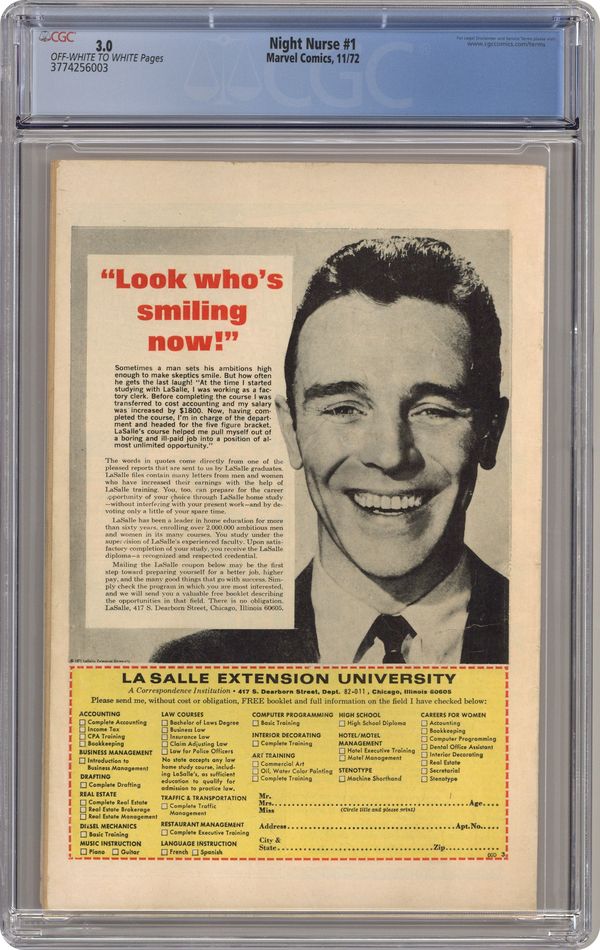 Ended May 24 2024 Winning Bid $77 Cover art by Win Mortimer. "The Making of a Nurse!", script by Jean Thomas, art by Win Mortimer; Linda Carter, Georgia Jenkins, and Christine Palmer all study to be nurses; Marshall Michaels asks Linda Carter to marry him but insists that she give up on being a nurse; When all of the city's power goes out Ben Jenkins (Georgia's brother) and Rocky try to hold the hospital's generator hostage; When Ben listens to his sister and tries to stop Rocky he is shot; Linda turns down Marshall's marriage proposal to become a nurse. Ad for The Cat comic book series. 36 pgs., full color. Cover price $0.20. Grade: CGC 3.0 explanation of grade Condition: Used (collectible)