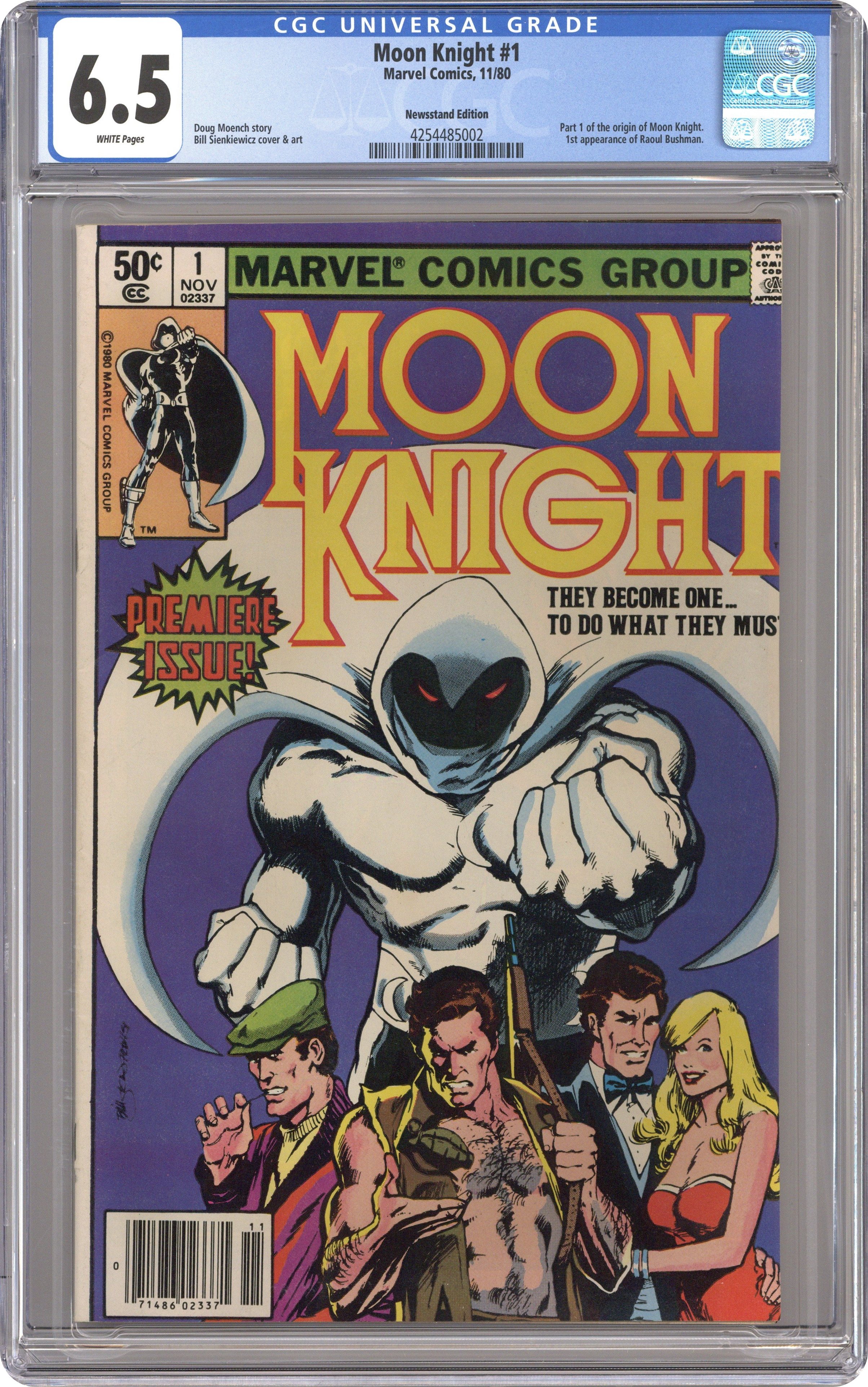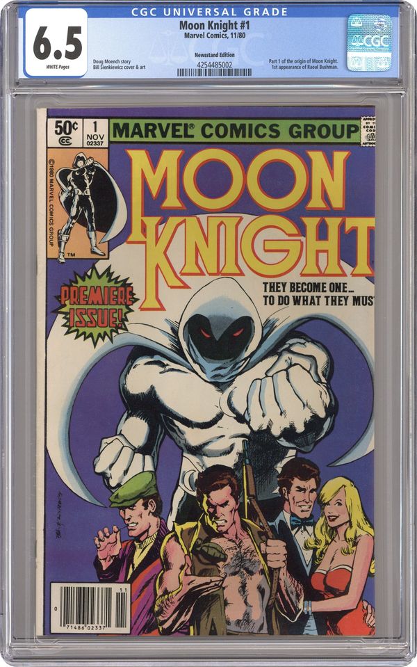 Newsstand Edition. "The Macabre Moon Knight!" Written by Doug Moench. Art by Bill Sienkiewicz. Mercenary, Wall Street wizard, a street smart cabbie, masked-avenger - Marc Spector is all of these things and more. Nothing before could have possibly prepared you for the strange world of Moon Knight! 32 pages, FC. NOTE: 1st appearance of Bushman. Cover price $0.50. Grade: CGC 6.5 explanation of grade Condition: Used (collectible)