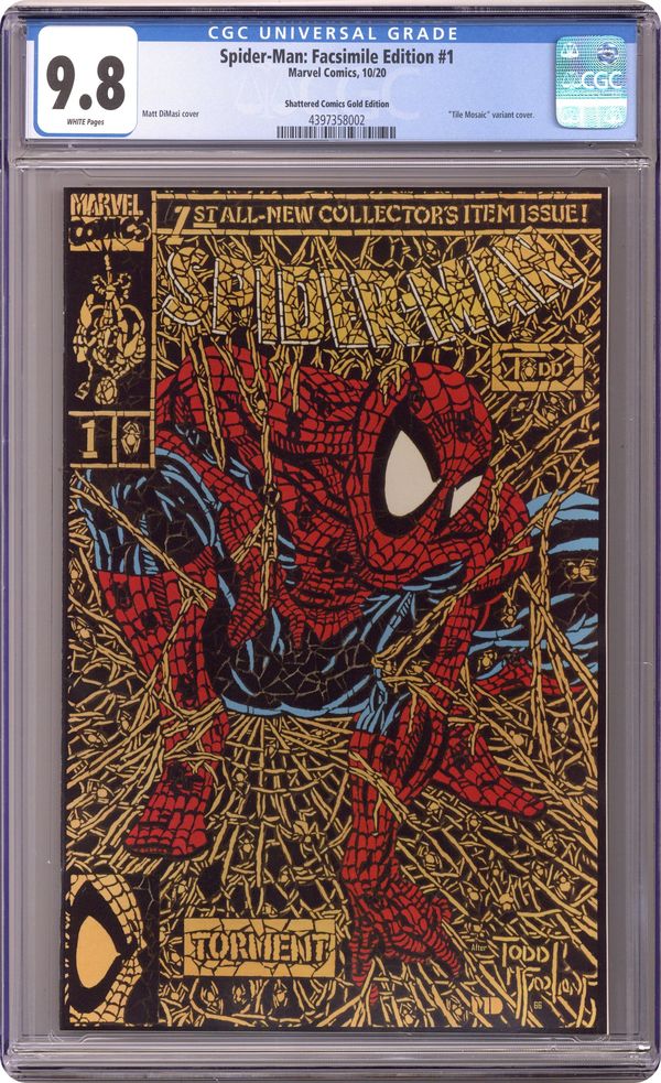 Shattered Comics exclusive gold variant cover by Matt Dimasi. Story and Art by Todd McFarlane. Celebrating the 30th Anniversary of Spider-Man #1 In 1990, superstar AMAZING SPIDER-MAN artist Todd McFarlane wanted to stretch his creative muscles as a writer - and the result was a brand-new SPIDER-MAN book that needed no superlative! Boasting one of the most famous comic-book covers ever drawn, the record-breaking first issue sold over two million copies - and inside, McFarlane's Spider-Man looked more extraordinary than ever. But why has Spidey's classic foe the Lizard begun a brutal killing spree? As the pounding drums spell doom, the torment is only beginning for Spider-Man and Dr. Curt Connors! It's one of the all-time great Marvel comic books, boldly re-presented in its original form, ads and all! Reprinting SPIDER-MAN (1990) #1. 32 pages, full color. Rated T Cover price $3.99. Grade: CGC 9.8 explanation of grade Condition: Used (collectible)