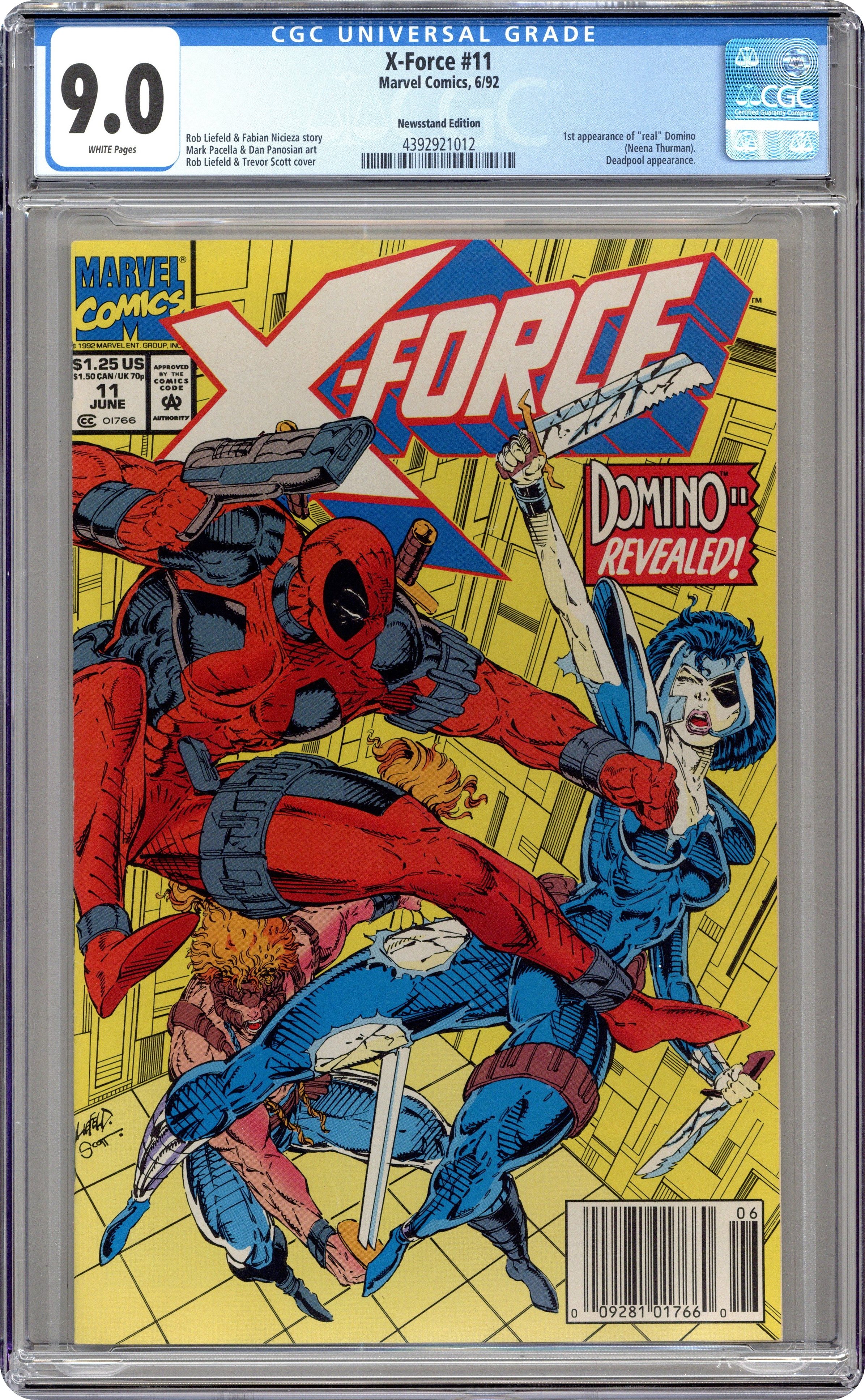 Direct Edition. First appearance of 'real' Domino (Neena Thurman). "Friendly Reminders" Cover pencils by Rob Liefeld, inks by Trevor Scott. Friendly Reminders, script by Rob Liefeld (Plot) by Fabian Nicieza, pencils by Mark Pacella, inks by Dan Panosian; Deadpool invades the X-Force complex to confront "Domino," really his old shapeshifting girlfriend Vanessa who has been spying on Cable and crew. Cover price $1.25. Grade: CGC 9.0 explanation of grade Condition: Used (collectible)