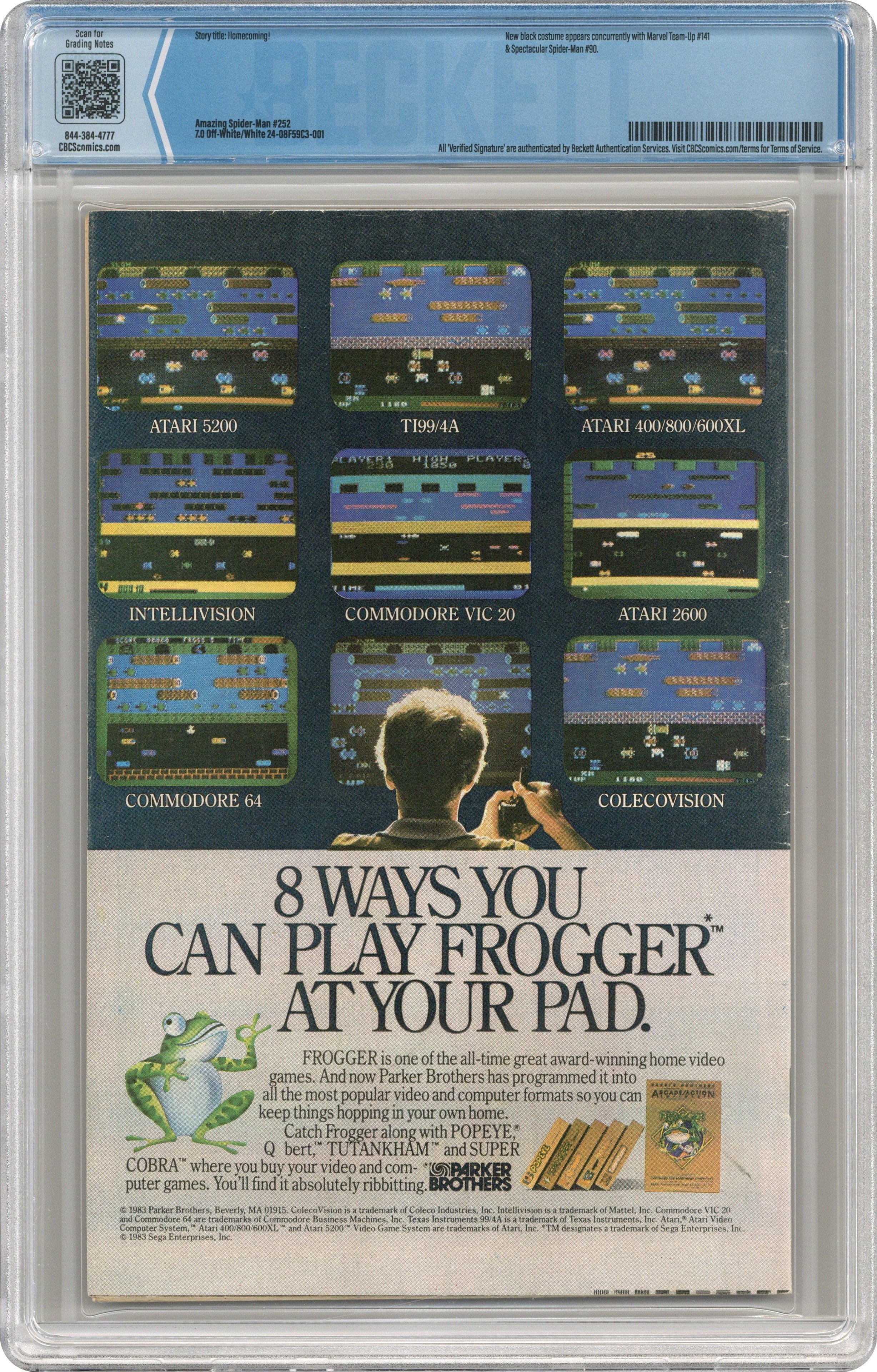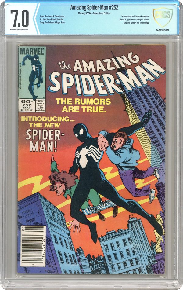 Ended Jun 22 2024 Winning Bid $115 Newsstand Edition. First appearance of Spider-Man's new black (alien symbiote) costume in "Homecoming!" Plot by Roger Stern. Script by Tom DeFalco. Pencils by Ron Frenz (breakdowns) and Brett Breeding (finishes). Cover by Ron Frenz and Klaus Janson. One of the landmark issues of the Amazing Spider-Man! With a brilliant flash of light in Central Park, the wondrous wall-crawler is back! And he looks a whole lot different! Wow, a new costume! What happened during the Secret Wars on the Beyonder's world? The ominous truth will be revealed to both the readers and the web-slinger in the days and weeks ahead! Cameo appearances by the Black Cat, Dr. Curt Connors, J. Jonah Jameson, Joe Robertson , Aunt May, Captain America, Captain Marvel, Hawkeye, Iron Man, Thor, and the Wasp. (Notes: Marvel Age 12 contained sketches of the new costume two months prior to the publication of this issue. Spidey's new costume was also unveiled in Marvel Team-Up 141 and Spectacular Spider-Man 90. The first issue of the (1984) Marvel Super Heroes Secret Wars Limited Series was published the same month as Amazing Spider-Man 252. The web-slinger discovers his new costume in issue 8 of the limited series. The Frenz-Janson cover is a tribute to the iconic cover of Amazing Fantasy 15. This story was reprinted in Marvel Tales 266. The letters page contains a statement of ownership: average print run 470,527; average paid circulation: 241,762. 36 pgs. Cover price $0.60. Grade: CBCS 7.0 explanation of grade Condition: Used (collectible)