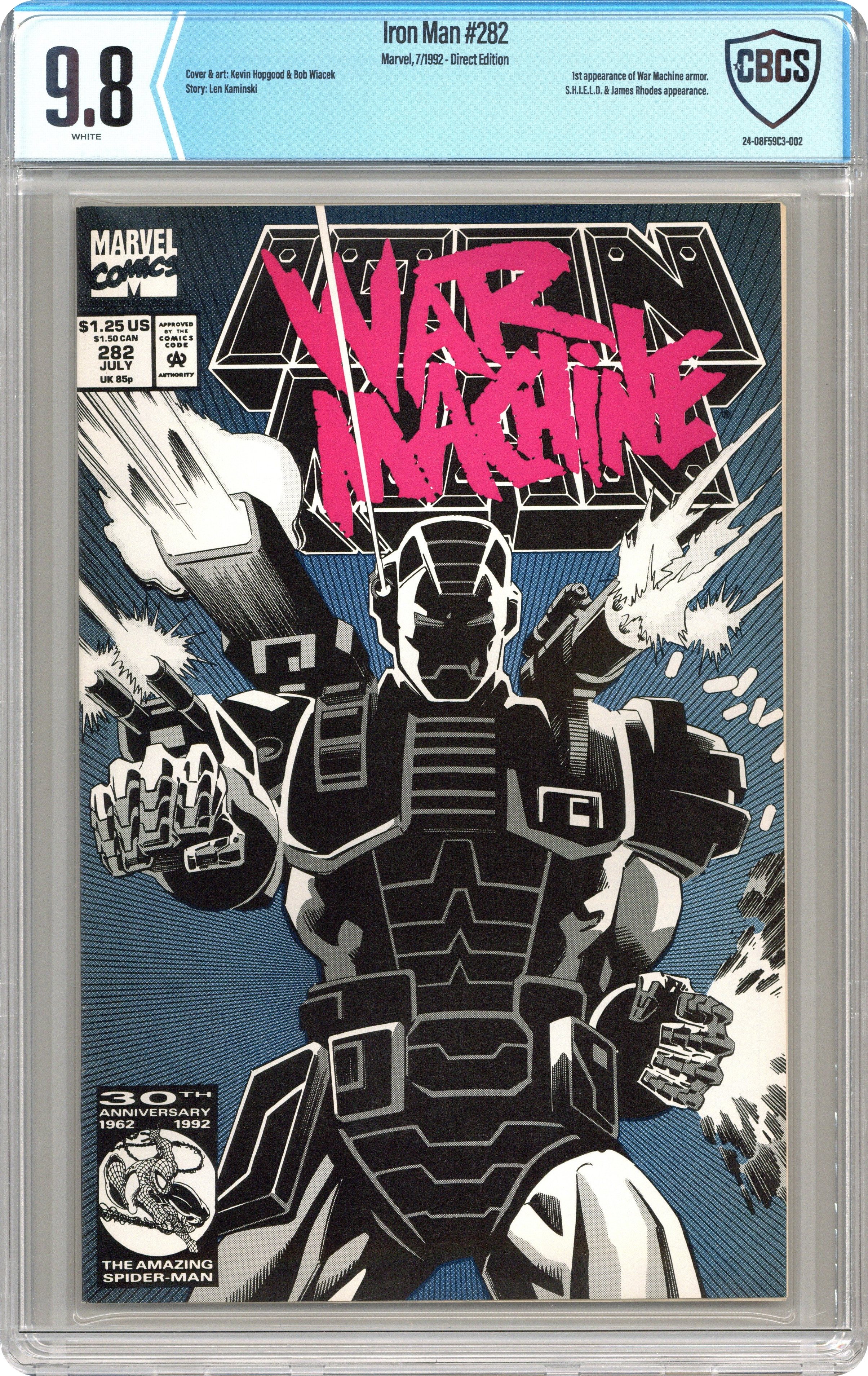Direct Edition. "War Machine" Part 2 of 3. First (full) appearance of the War Machine armor. Script by Len Kaminski. Pencils by Kevin Hopgood. Inks by Bob Wiacek. Cover by Kevin Hopgood and Bob Wiacek. The Masters of Silence came to Stark Enterprises last issue looking for a fight! And now the trio is getting one in spades thanks to the War Machine armor! In a remarkable display of firepower; Tony Stark, clad in the new gray & white armor, trounces his would-be assassins! In the meantime, Jim Rhodes contacts SHIELD to learn who framed Stark Enterprises for the deadly accident in Japan! And it turns out to be someone the armored avenger knows very, very well! Cameo appearances by Justin Hammer and Nick Fury. (Note: The cover to issue 282 was reprinted as the cover to Iron Man (1968 1st series) Marvel Legends Reprint 281.) 32 pages. Cover price $1.25. Grade: CBCS 9.8 explanation of grade Condition: Used (collectible)
