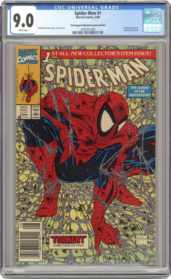 Unbagged Newsstand Edition. Torment: Part 1 of 5. Story, art and cover by Todd McFarlane. Fresh off his legendary run on Amazing Spider-Man, super-star artist Todd McFarlane is given the reigns to his very own Spidey title. Right out of the gate the wall-crawler will be challenged like never before as mysterious and ominous drums in the distance are driving the savage Lizard to cut a swath of death and destruction through the streets of New York City. Can Spider-Man discover the one responsible for this madness before his arch foe causes more damage? NOTE: Webbing on cover may be grey or purple. Cover price $1.75. Grade: CGC 9.0 explanation of grade Condition: Used (collectible)