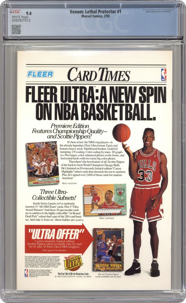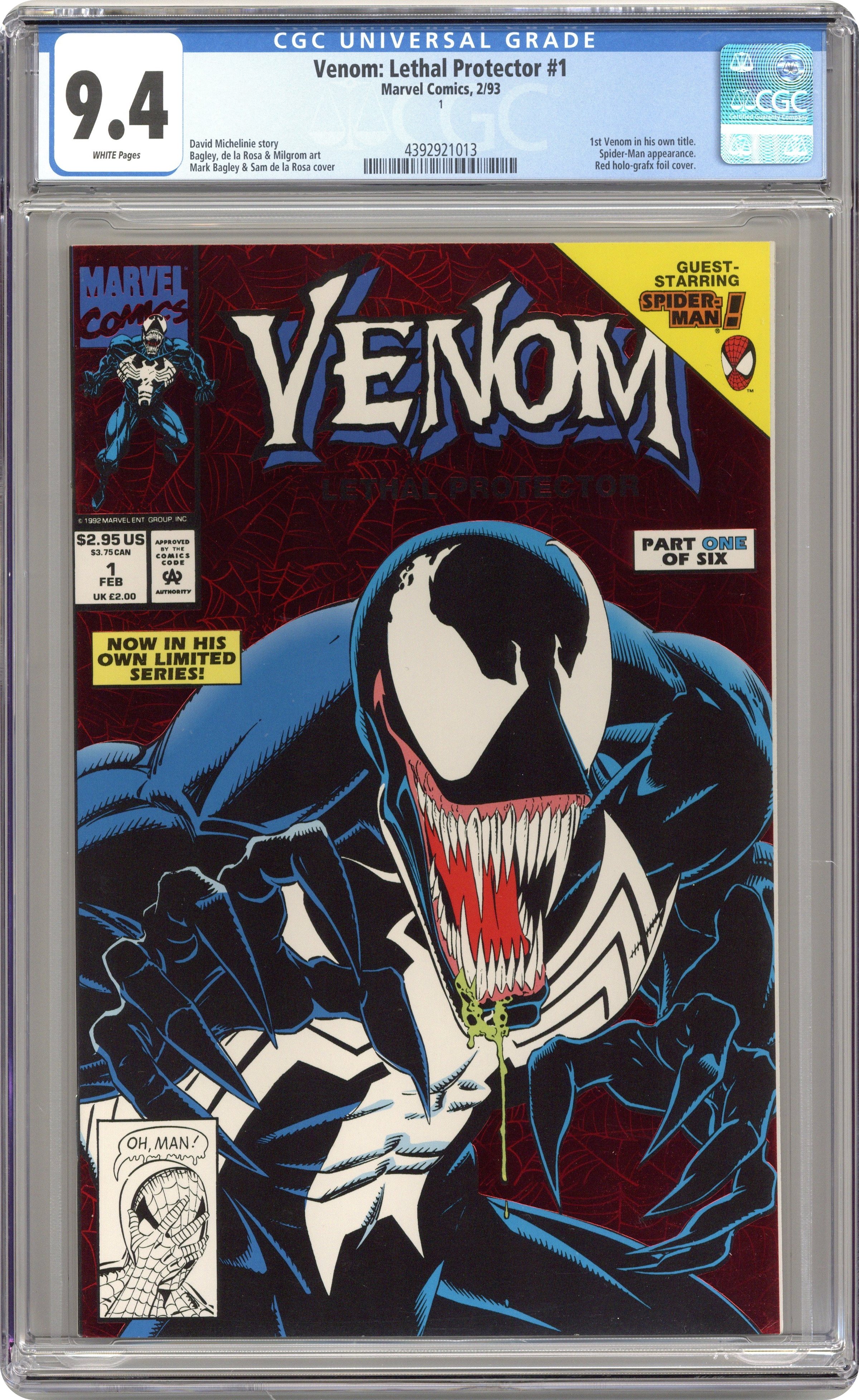 Direct Edition. Red Foil Enhanced CardStock cover, art by Mark Bagley and Sam de la Rosa. Lethal Protector Part 1: Dark Soul Drifting, script by David Michelinie, pencils by Mark Bagley, inks by Al Milgrom and Sam de la Rosa; Venom moves to San Fransisco to try out his new protection of innocents racket; Venom and Spidey save a group of homeless folk. 36 pgs., full color. $2.95. Cover price $2.95. Grade: CGC 9.4 explanation of grade Condition: Used (collectible)