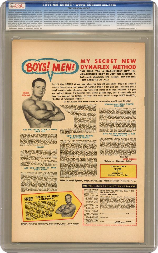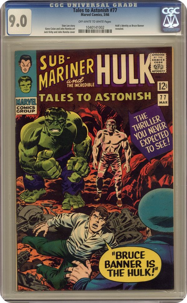 Cover by Jack Kirby and John Romita. To Walk Amongst Men!, script by Stan Lee, art by Gene Colan (as Adam Austin) and Vince Colletta; When earthquakes rock Atlantis, Namor heads to the surface to find out what is causing the mayhem; What he finds is a giant drill being utilized by Hank Pym as he searches for clues to the origins of life on earth. Bruce Banner Is the Hulk!, script by Stan Lee, art by Jack Kirby and John Romita; The Hulk and the Executioner battle for the fate of the future earth and once the Asgardian is defeated, the Hulk returns back to his own time; Hounded by the military and thinking that Banner and the Hulk are dead, Rick tells Talbot the secret of the Hulk's alter ego. Ad for Fantasy Masterpieces #1. 36 pgs., full color. $0.12. Cover price $0.12. Grade: CGC 9.0 explanation of grade Condition: Used (collectible)