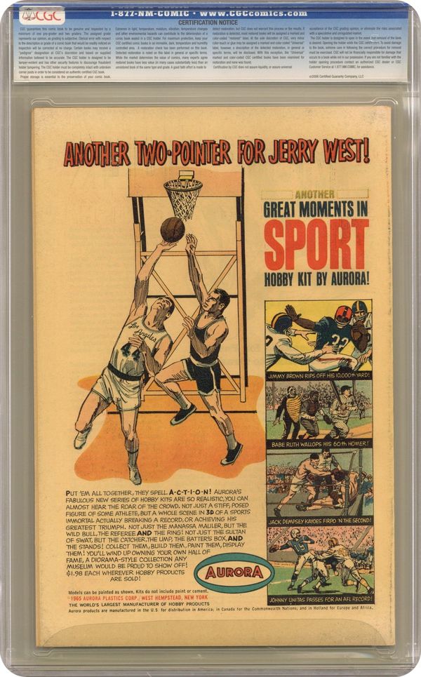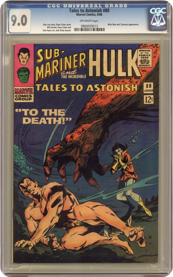 Ended Oct 17 2024 Winning Bid $100 Cover by Gene Colan and Bill Everett. To the Death!, script by Stan Lee, art by Gene Colan and Dick Ayers; Namor battles the Behemoth with the fate of Atlantis hanging in the balance; Krang has Puppet Master build a puppet of the Behemoth so he can control the creature mentally; Even under Krang's control, Namor is able to beat the monster; Krang snatches victory from defeat, however, when he shows up in Atlantis and informs the Lady Dorma that he will use the puppet to bring the Behemoth back unless she agrees to marry him. They Dwell in the Depths!, script by Stan Lee, art by Jack Kirby and Bill Everett; The Hulk is pulled into the underground kingdom of Tyrannus who has been separated from the fountain of youth and has become a feeble old man; The Jade Giant's old foe asks for his help in retaking the fountain from his rival, the Mole Man, and he makes his argument for assistance stronger by revealing that he has captured Rick, Betty and Glenn; When Betty mentions Banner, Hulk goes wild but his destruction is put to an abrupt end as the Mole Man attacks. 36 pgs., full color. $0.12. Cover price $0.12. Grade: CGC 9.0 explanation of grade Condition: Used (collectible)