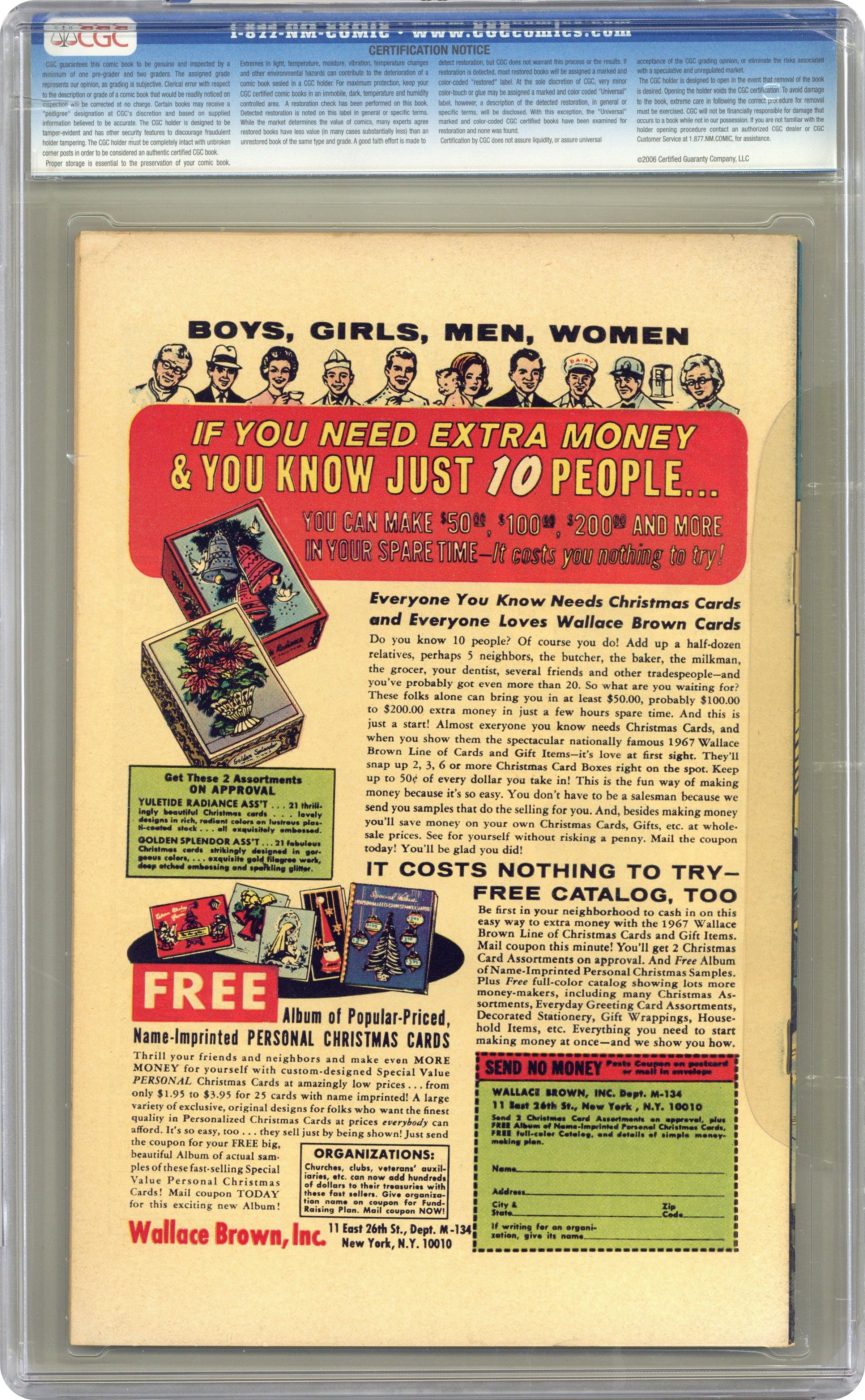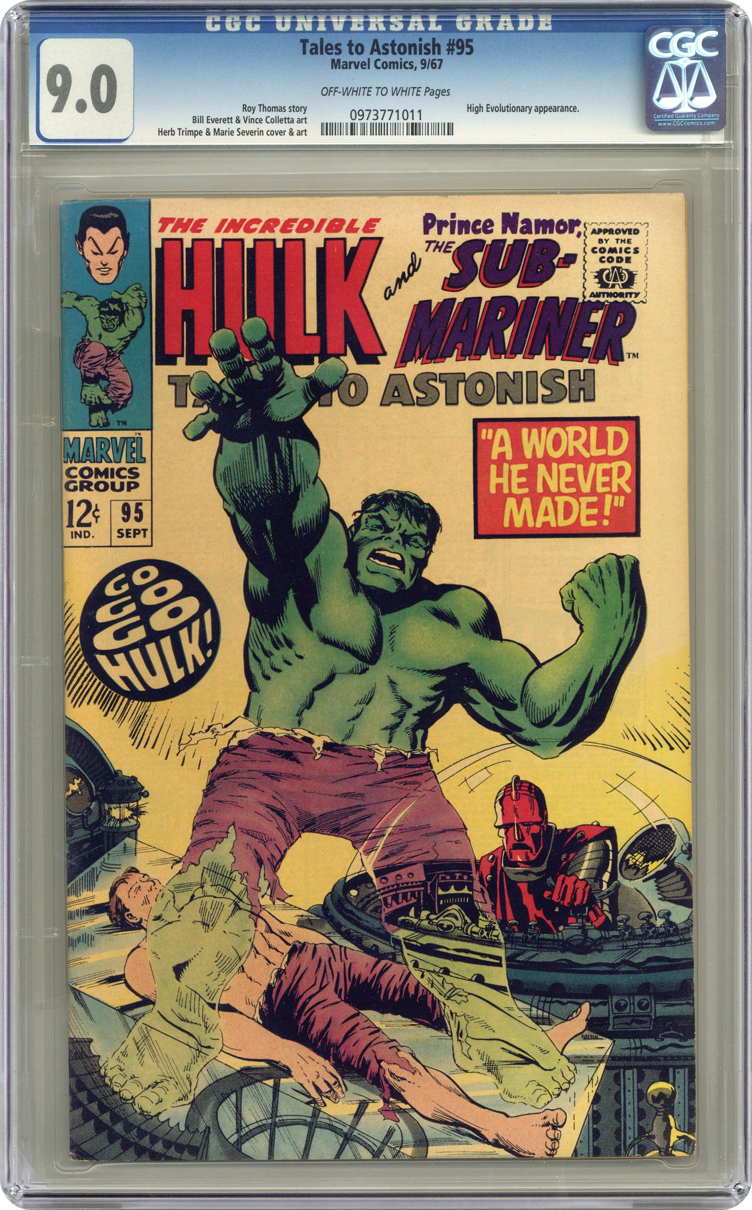 Ended Oct 17 2024 Winning Bid $125 Cover by Marie Severin. The Power of the Plunderer!, script by Roy Thomas and Raymond Marais, art by Bill Everett and Vince Colletta; As Namor and Dorma return to Atlantis from Dragorr's island, they come across an underwater city built by surface men; Namor bristles at the invaders and has words with the city's founder and creator, Dr. Walter Newell; As the two men parlay, the Plunderer shows up in a powerful sub and punches a hole in the dome that covers the city; Namor confronts the Plunderer but is forced to leave the villain as he sees that Dorma is in trouble. A World He Never Made!, script by Stan Lee, art by Marie Severin and Herb Trimpe; While being transported to the planet of Wundagore II, the Hulk finds himself transforming once again into puny Banner; Arriving at the base of the High Evolutionary who needs the power of the Hulk to battle his bestial New Men, the Evolutionary is disappointed to find a normal human instead of a gamma spawned powerhouse but decides he can still use Banner as an ally by evolving him a thousand years into humanity's future. 36 pgs., full color. $0.12. Cover price $0.12. Grade: CGC 9.0 explanation of grade Condition: Used (collectible)