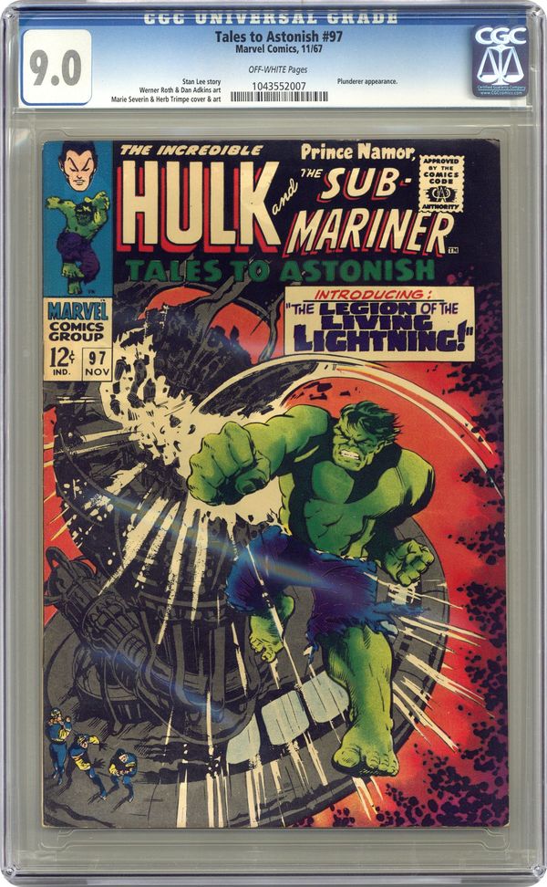 Ended Oct 22 2024 Winning Bid $84 Cover by Marie Severin and Dan Adkins. The Sovereign and the Savages, script by Roy Thomas, art by Werner Roth and Dan Adkins; Namor is on Skull Island in the Savage Land as a prisoner of the Plunderer; The villain tries to entice the Sub-Mariner into becoming his partner in world conquest by trying to impress him with his powerful vibra-gun constructed from Plunderstone (the Savage Land's version of vibranium); When the local Swamp Men attack, Namor is freed and the Plunderer's base begins to burn to the ground. The Legions of: The Living Lightning, script by Stan Lee, art by Marie Severin and Herb Trimpe; The Hulk rescues a downed pilot and ends up being captured and brainwashed by a subversive militia group known as the Living Lightning. 36 pgs., full color. $0.12. Cover price $0.12. Grade: CGC 9.0 explanation of grade Condition: Used (collectible)