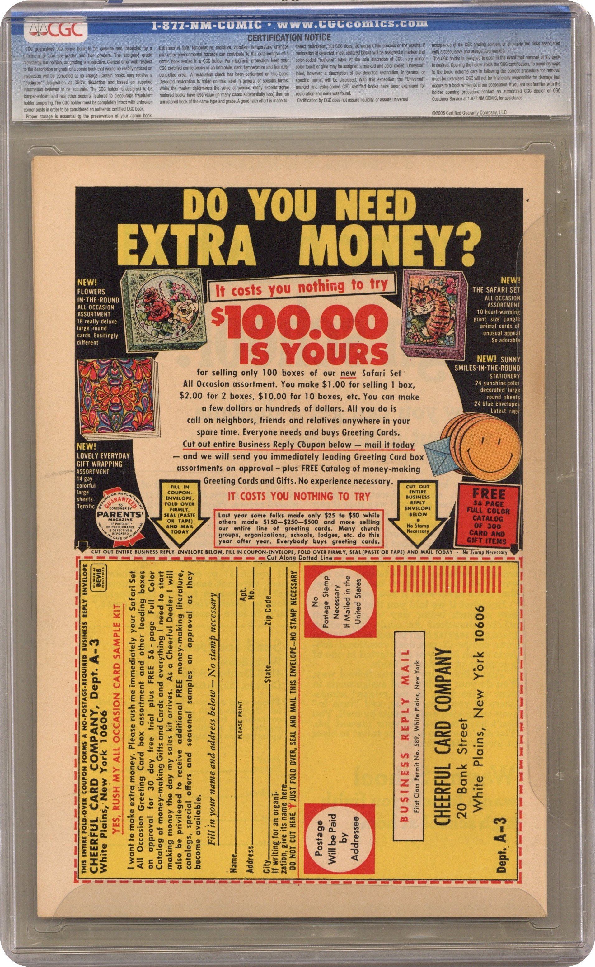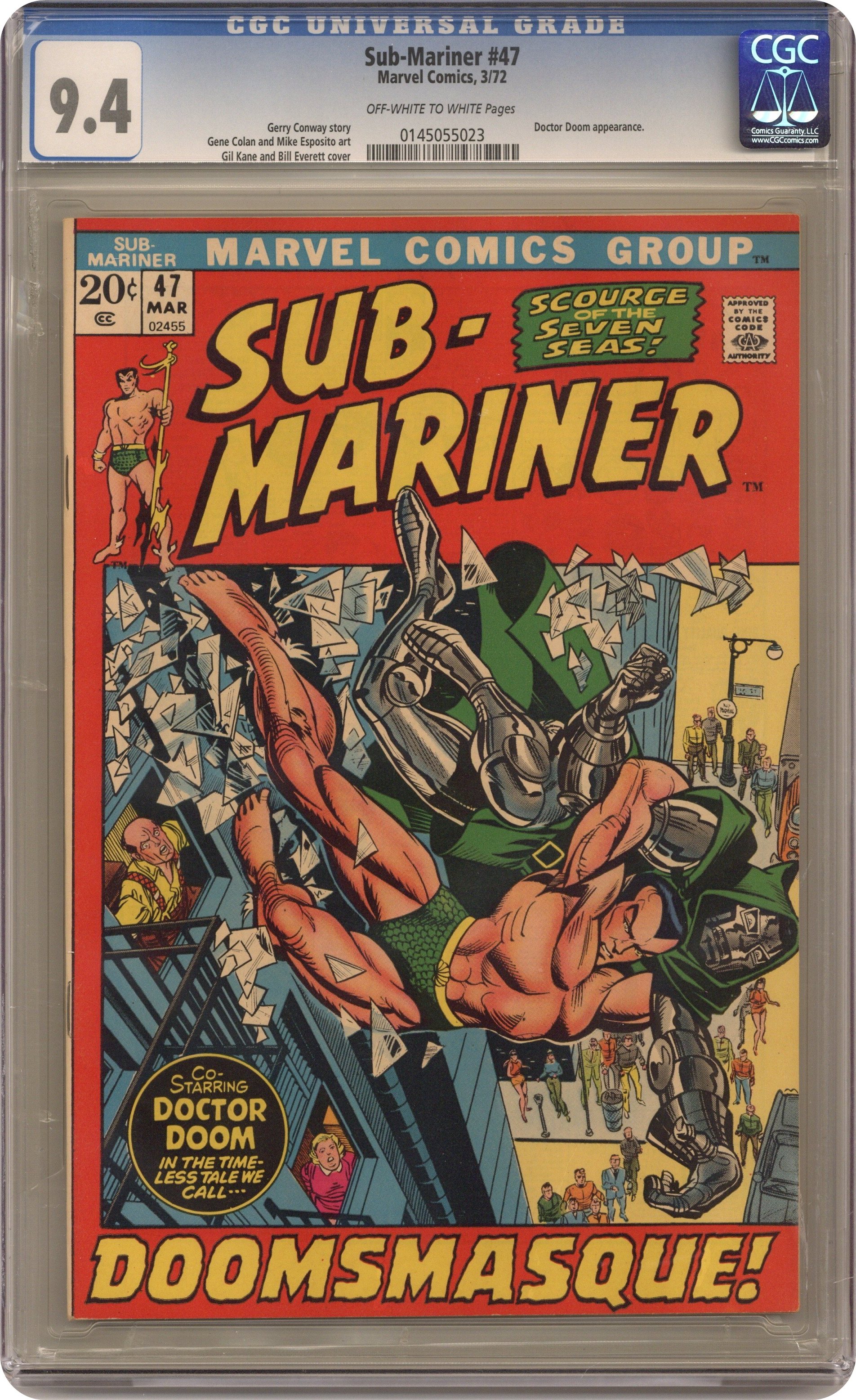 Cover pencils by Gil Kane and John Romita (alterations), inks by Bill Everet and John Romita (alterations). "Doomsmasque," script by Gerry Conway, pencils by Gene Colan, inks by Mike Esposito; Namor, without his memories and haunted by the figure of his father, is injured escaping from the authorities and is taken in by a young woman; However, Namor has drawn the attention of Dr. Doom who is well aware of Namor's memory loss and is eager to get him to join his cause; Fortunately, pieces of his memory convince Namor that Doom isn't to be trusted and attacks him; Their battle is stopped by the young woman, Cindy Jones, who took Namor in and Dr. Doom invites them both to the Latverian Embassy; Doom tricks Namor into becoming his ally once again and they head out to attack an A.I.M. installation so that Doom can get his hands on the Cosmic Cube. 36 pgs., full color. $0.20. Cover price $0.20. Grade: CGC 9.4 explanation of grade Condition: Used (collectible)