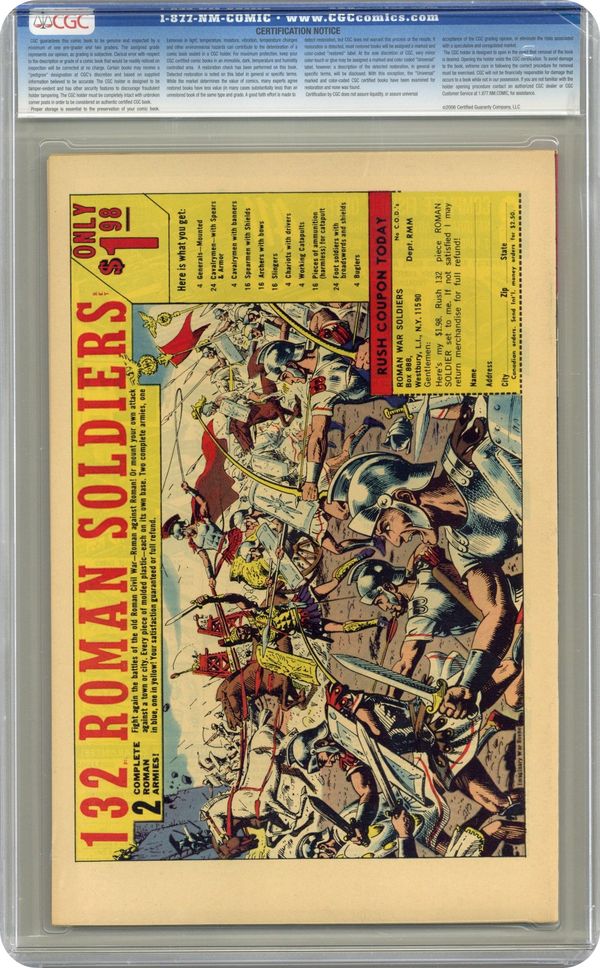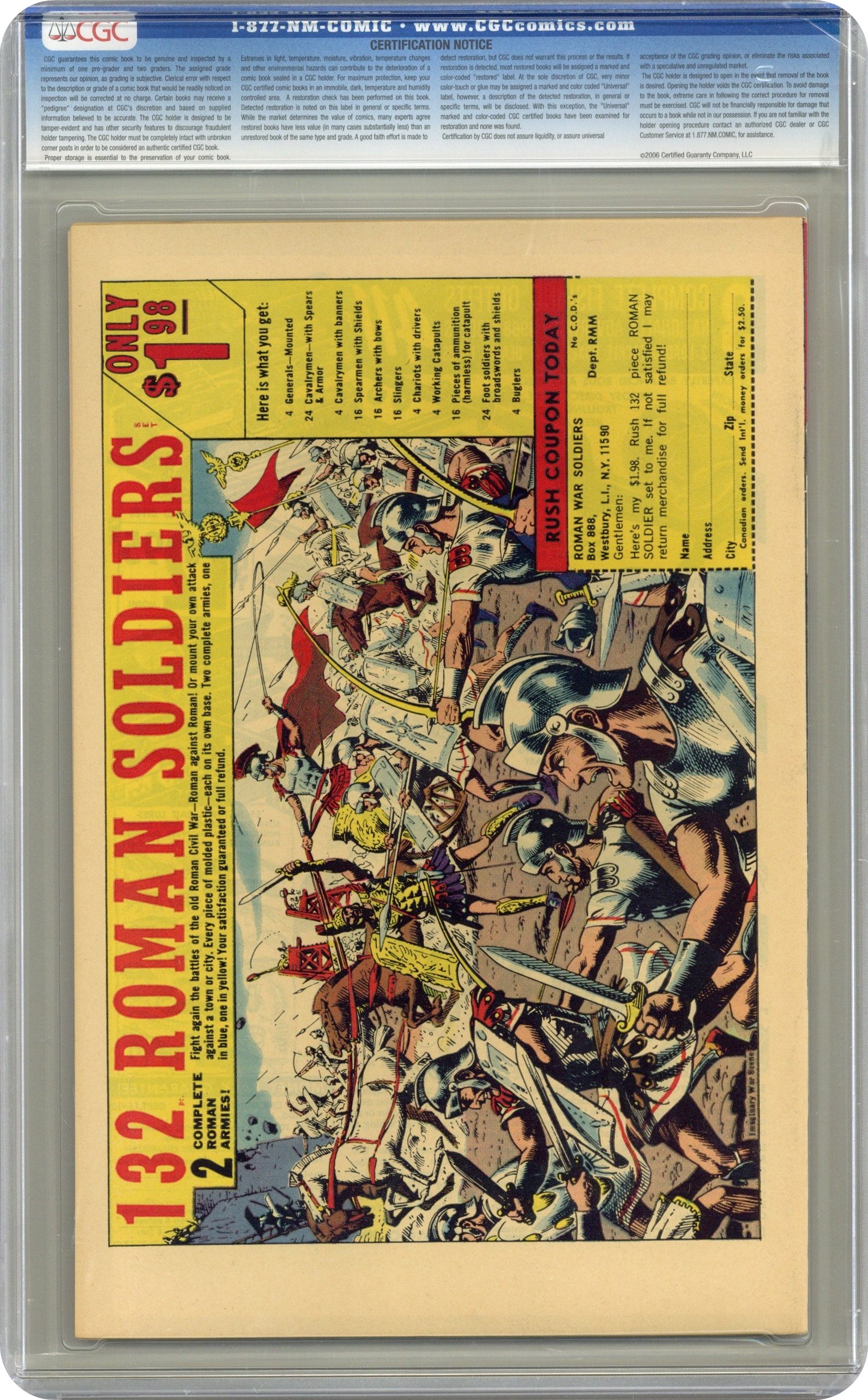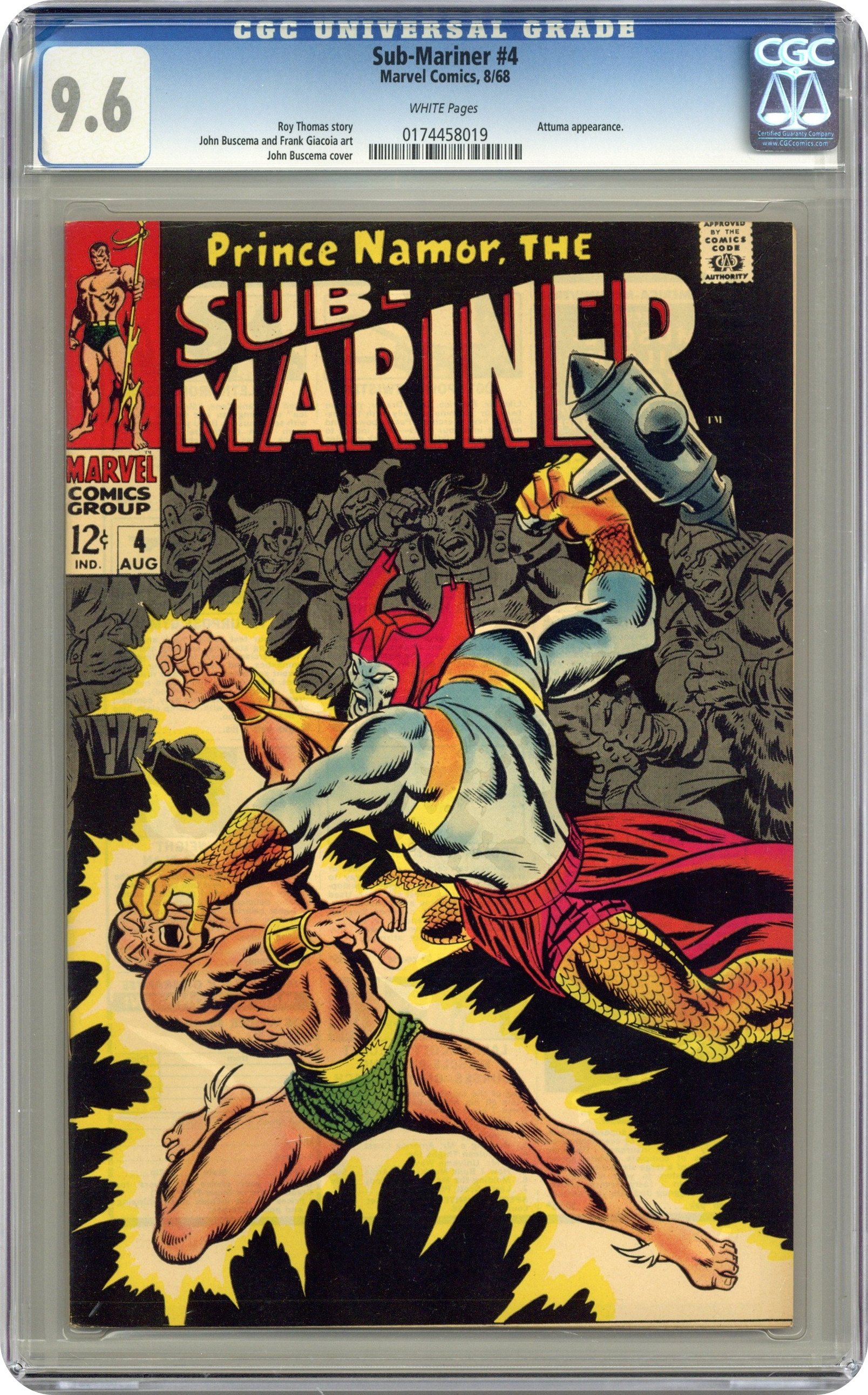 "Who Strikes for Atlantis?!" Written by Roy Thomas. Art by John Buscema and Frank Giacoia. The Oceans tremble as the undersea warlord Attuma sieges the Kingdom of Atlantis! 32 pages, FC. Cover price $0.12. Grade: CGC 9.6 explanation of grade Condition: Used (collectible)