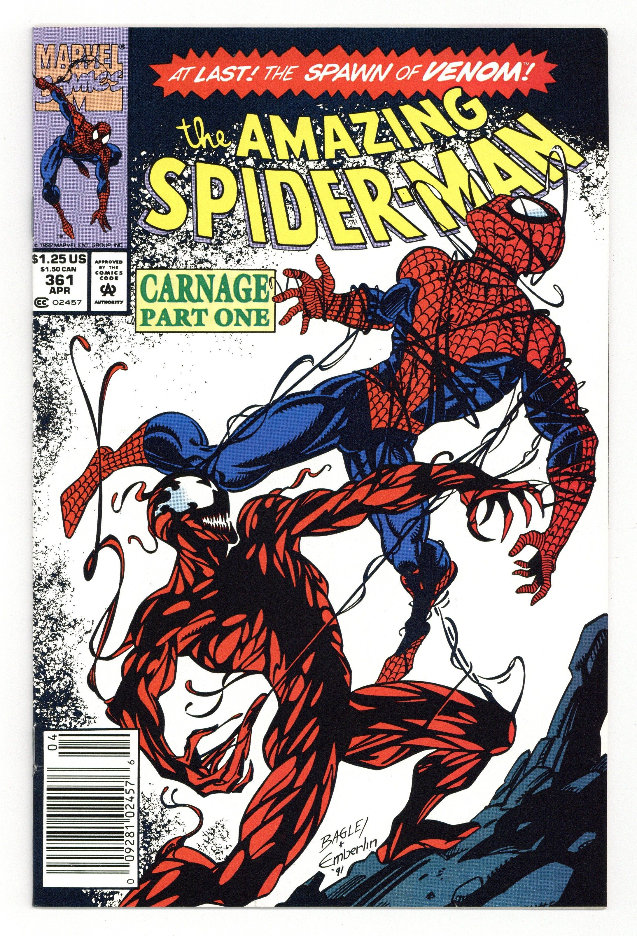 Ended Aug 4 2025 Bid History 27 bids Winning Bid $92 First Printing. Newsstand Edition. First (full) appearance of Carnage in "Savage Genesis!" Part 1 of 3. Script by David Michelinie. Pencils by Mark Bagley. Inks by Randy Emberlin. Cover by Mark Bagley and Randy Emberlin. Blood runs in the streets as a serial killer roams New York City! And as the web-slinger investigates the murders, he notices a very disturbing similarity to another killer's modus operandi! In a burned-out building in Brooklyn, the spectacular one comes face-to-face with his new homicidal foe...Carnage! Can the wall-crawler end Cletus Kasady's rampage in their very first encounter? Cameo appearances by Aunt May and Mary Jane Watson. Flashback cameo by Venom. (Note: This three-part story was reprinted in 2011 in the trade paperback: Spider-Man -- The Vengeance of Venom.) 36 pages, full color. $1.25 cover price. NOTE: Most of these were distributed with slight printer tears in the bottom edge of the cover. Cover price $1.25. Grade: VF+ 8.5 explanation of grade Condition: Used (collectible)