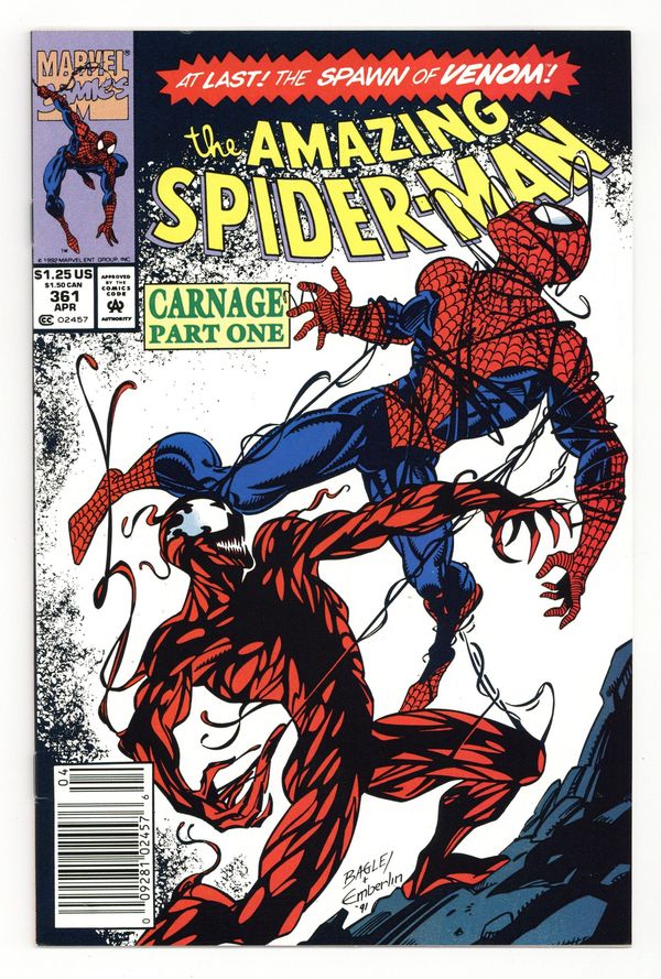 First Printing. Newsstand Edition. First (full) appearance of Carnage in "Savage Genesis!" Part 1 of 3. Script by David Michelinie. Pencils by Mark Bagley. Inks by Randy Emberlin. Cover by Mark Bagley and Randy Emberlin. Blood runs in the streets as a serial killer roams New York City! And as the web-slinger investigates the murders, he notices a very disturbing similarity to another killer's modus operandi! In a burned-out building in Brooklyn, the spectacular one comes face-to-face with his new homicidal foe...Carnage! Can the wall-crawler end Cletus Kasady's rampage in their very first encounter? Cameo appearances by Aunt May and Mary Jane Watson. Flashback cameo by Venom. (Note: This three-part story was reprinted in 2011 in the trade paperback: Spider-Man -- The Vengeance of Venom.) 36 pages, full color. $1.25 cover price. NOTE: Most of these were distributed with slight printer tears in the bottom edge of the cover. Cover price $1.25. Grade: VF+ 8.5 explanation of grade Condition: Used (collectible)