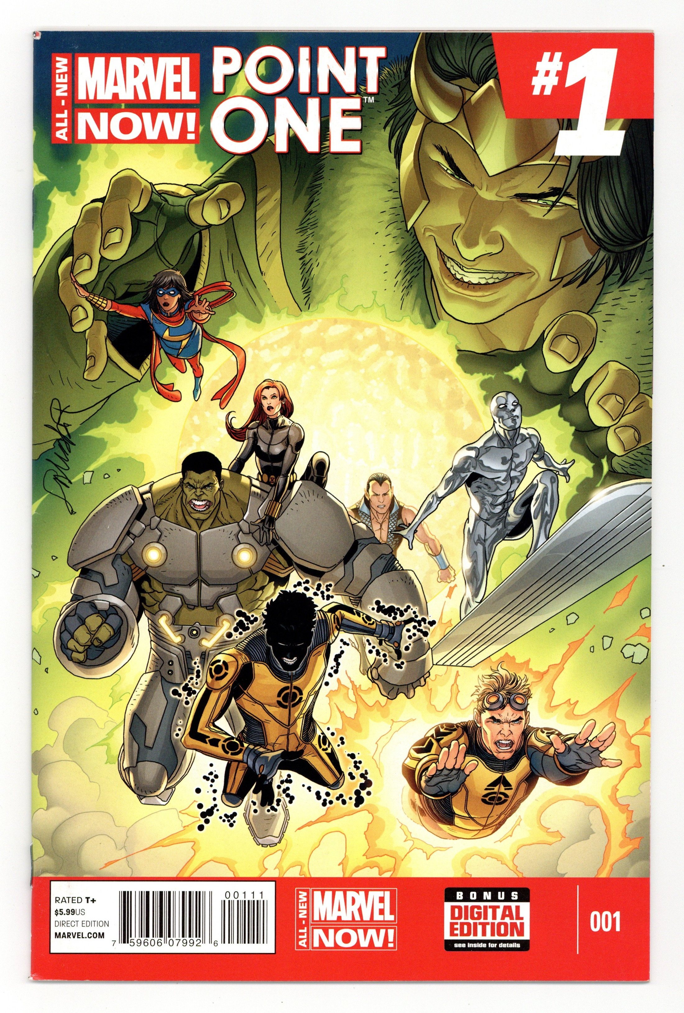 Cover by Salvador Larroca. Written by Al Ewing, Dan Slott, James Robinson, Nathan Edmondson, G. Willow Wilson, Nick Spencer. Art by Lee Garbett, Michael Allred, Steve Pugh, Phil Noto, Adrian Alphona, Rags Morales. Here we go again! It's your one-stop entry point to the world of ALL-NEW MARVEL NOW! Loki embarks on a mission for Asgard! The Silver Surfer and Dawn experience the cosmic rays of Nautikos! A Kree Pursuer and her Special Forces team prepare to invade the Earth! The Black Widow goes undercover in Russia! Who is the new Ms. Marvel? And can even the Indestructible Hulk survive the aid and assistance of fellow Avengers Cannonball and Sunspot? • Features completely new LOKI: AGENT OF ASGARD, SILVER SURFER, BLACK WIDOW, MS MARVEL, ALL-NEW INVADERS and AVENGERS WORLD lead-in stories! Note: First appearance of Kamala Khan as Ms. Marvel Cover price $5.99. Grade: VF- 7.5 explanation of grade Condition: Used (collectible)