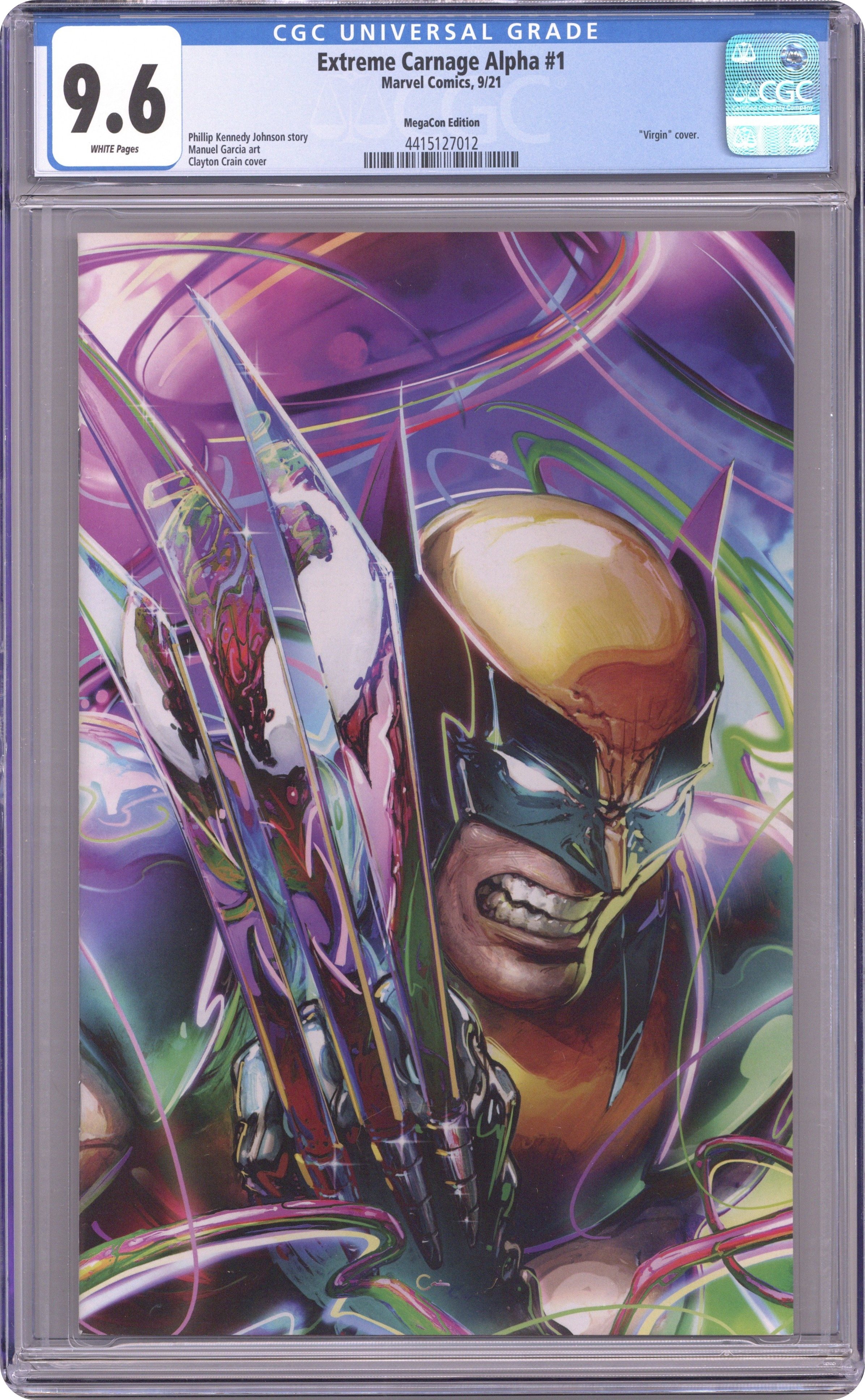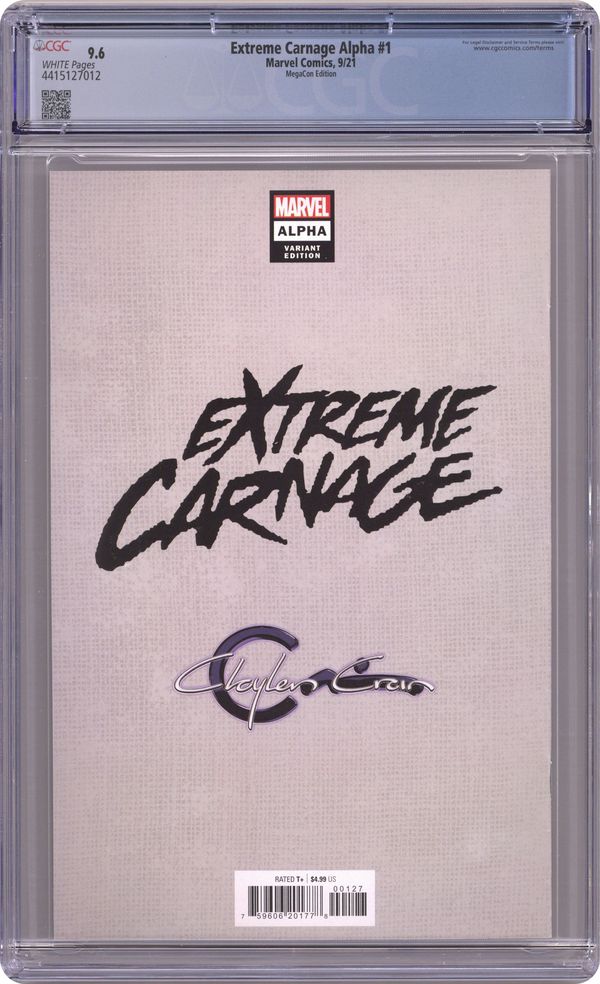 Clayton Crain Studios MegaCon exclusive cover by Clayton Crain. Written by Phillip Kennedy Johnson. Art by Manuel Garcia. VIOLENCE RUNS IN THE FAMILY! As the dust continues to settle after the species-redefining KING IN BLACK saga, Eddie Brock and his son, Dylan, won't be the only ones learning to adjust to a new normal. Collectively called the Life Foundation, symbiotes SCREAM, PHAGE, RIOT, LASHER and AGONY have tried to reconcile the sometimes-noble intentions of their hosts with their often-bloodthirsty impulses. But the Life Foundation symbiotes aren't the only ones with a part to play in this story, and they aren't the only symbiotes who find themselves reinvented after KING IN BLACK. They have an older sibling who may be reinvented in its own right: CARNAGE. 36 pages, full color. Rated T+ Grade: CGC 9.6 explanation of grade Condition: Used (collectible)