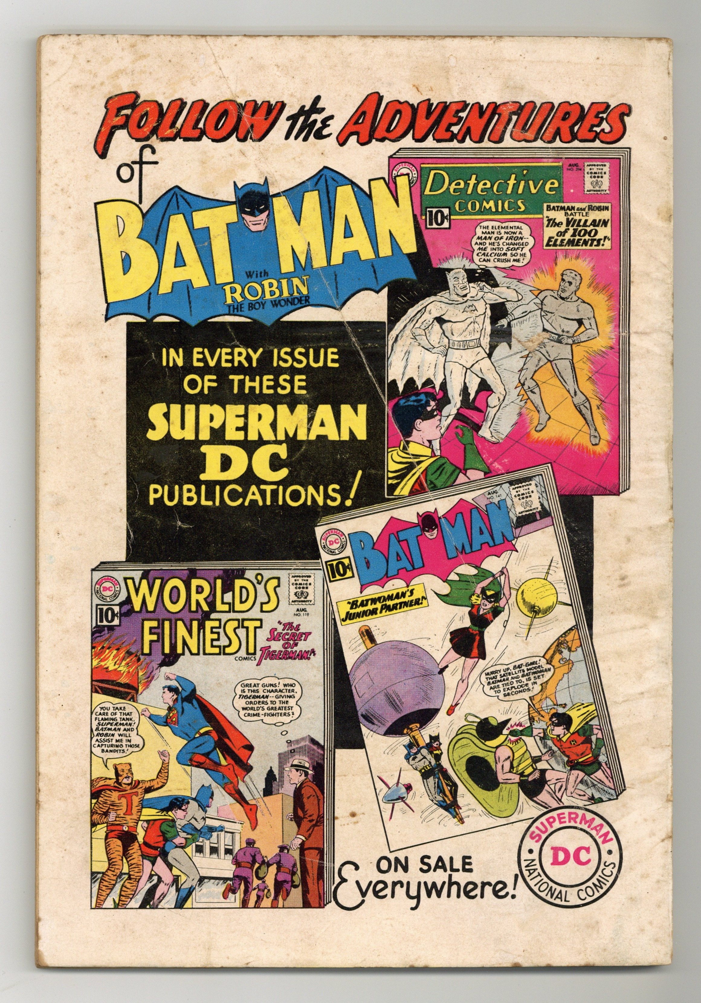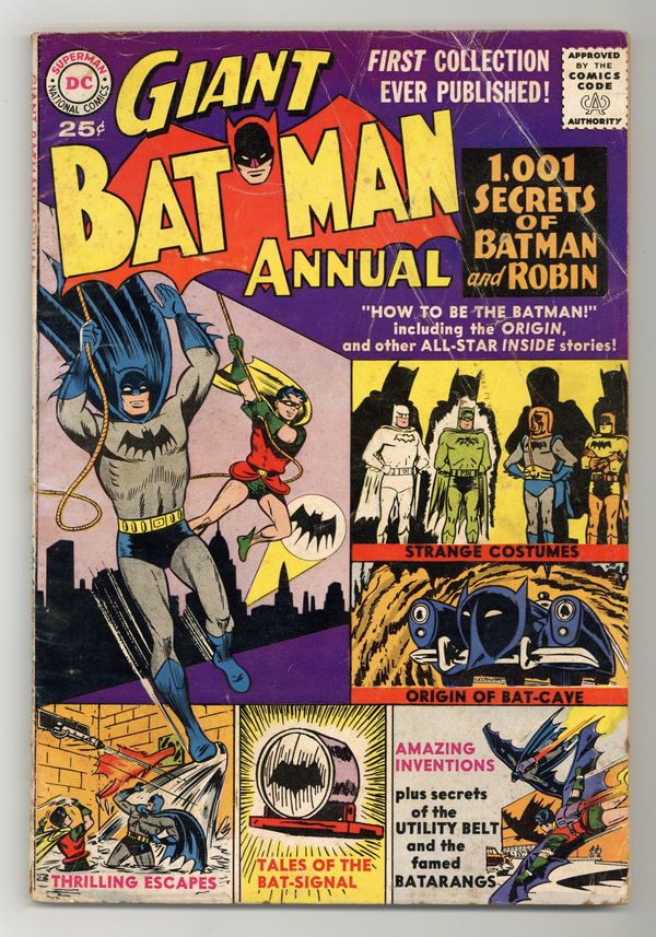 All reprints. Cover pencils by Curt Swan, Sheldon Moldoff, and Dick Sprang, inks by Charles Paris. "How to Be the Batman!", pencils by Lew Sayre Schwartz, inks by Charles Paris; Batman loses his memory after being exposed to amnesia gas, when the antidote fails, Robin must teach the Cowled Crimefighter all that he has forgotten; Origin retold. "The Strange Costumes of Batman!", script by Edmond Hamilton, pencils by Dick Sprang, inks by Charles Paris; A look at some of the specialized costumes that Batman has utilized over his career, including one garment that he had hoped never to use. "Untold Tales of the Bat-Signal!", script by David Vern, pencils by Lew Sayre Schwartz, inks by Charles Paris; Reporter Dave Purdy saves Batman by dazzling an approaching murderer with the Bat Signal; The Masked Manhunter is happy to let Purdy have the credit. Secrets of Batman's Utility Belt; Famed Batarang. "The Origin of the Bat-Cave!", script by Bill Finger, pencils by Sheldon Moldoff, inks by Charles Paris; Professor Nicholls sends the Dynamic Duo back in time 300 years, there they meet Jeremy Coe, a frontiersman spy who doubles as a Red Indian. "Batman's Electronic Crime-File!", pencils by Dick Sprang, inks by Charles Paris; The microfilm from Batman's crime file is stolen from the Bat-Cave. "Thrilling Escapes of Batman and Robin!", pencils by Sheldon Moldoff, inks by Charles Paris; Villainous Paul King captures Batman and Robin, he then sets about devising an inescapable trap, based on Robin's recollections about their previous ingenious escapes. "The Amazing Inventions of Batman," script by Edmond Hamilton, pencils by Dick Sprang, inks by Charles Paris; Batman gets word that one of his inventions is to be used against him, he and Robin must then examine their many crime fighting innovations for clues. Superman ad. Secret Origins ad. Batman with Robin the Boy Wonder ad. 84 pgs., full color. Cover price $0.25. Grade: GD 2.0 explanation of grade Condition: Used (collectible)