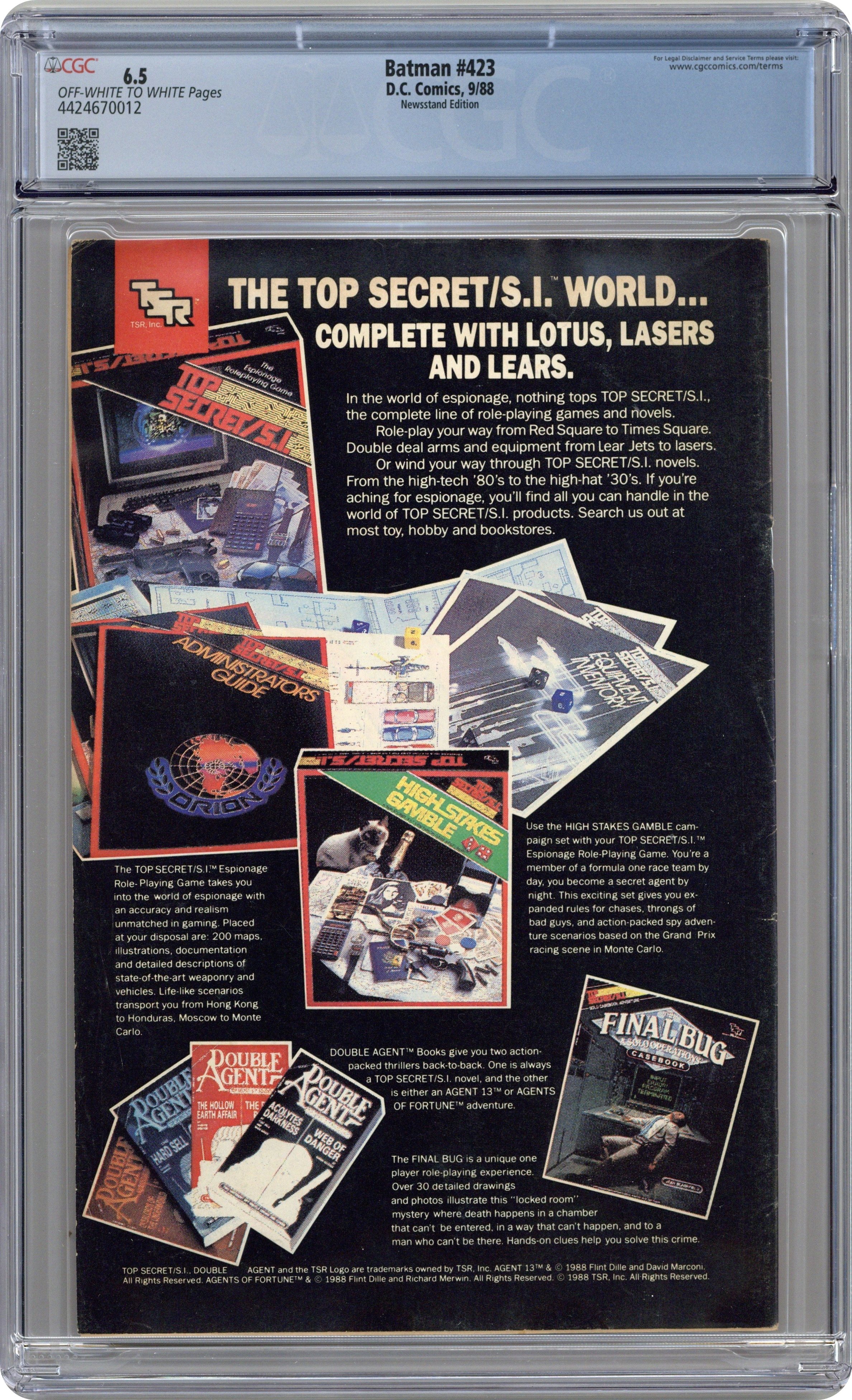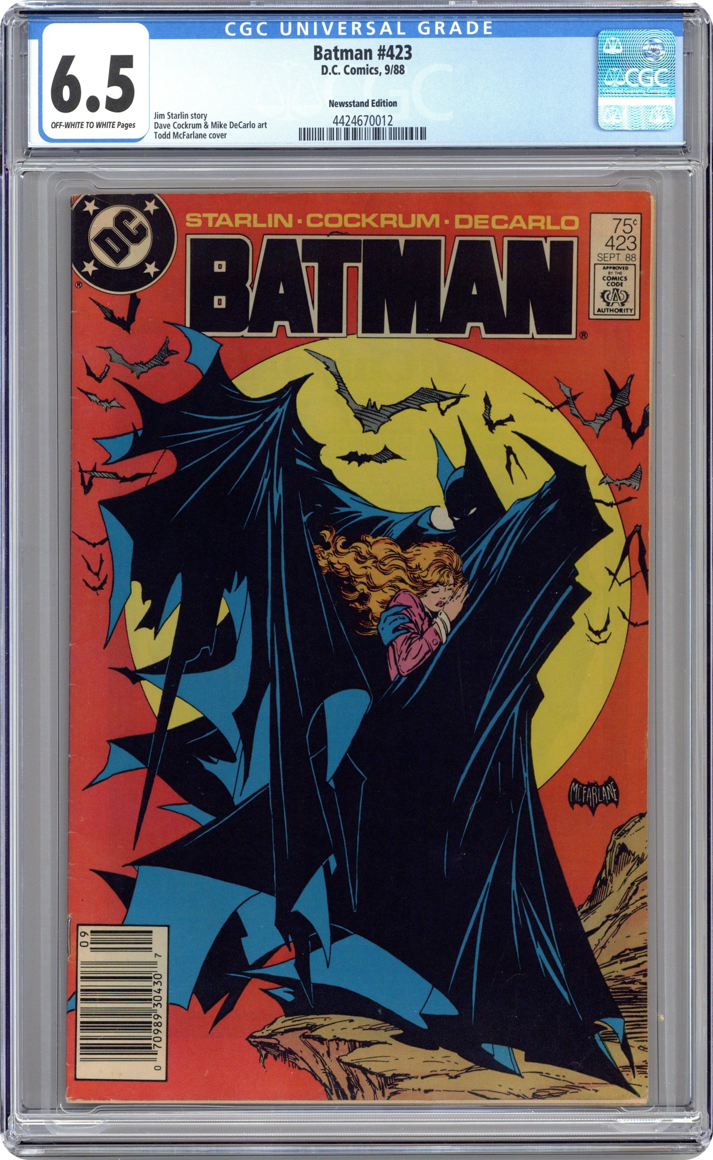 First Printing. Newsstand Edition. Three cops relate three tales of the Dark Knight, revealing different facets of Batman's character, in "You Shoulda Seen Him..." Script by Jim Starlin, pencils by Dave Cockrum, inks by Mike DeCarlo. Todd McFarlane cover. 1st printing. NOTE: Most issues from 397-432 were reprinted in 1989 and sold in multipacks. These 2nd and 3rd prints have back cover ads dated 1989. 36 Pages, Full Color. Cover price $0.75. Grade: CGC 6.5 explanation of grade Condition: Used (collectible)