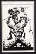 WOW what an incredible splash page! After a days-long battle that stopped only because T'Challa's allies yielded the fight so he wouldn't die, Killmonger has become the Black Panther and ruler of Wakanda. Velluto and Almond deliver a powerful image here with Killmonger's figure full of fury and triumph as he clasps the fallen Panther's mask in his hand. Also included is Velluto's rough layout sketch which measures 4" x 6" (signed, pencil on paper). Signed by the artists in gold marker at the bottom of the piece. Pencil and ink on Marvel Comics art board. 11" x 17 1/4".
