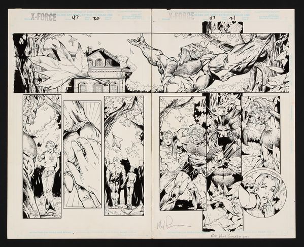 Against the wishes of...well everyone else on the team, Boom Boom has decided to befriend Sabretooth who at this point in X-lore is a changed man thanks to a claw through the brain from Wolverine. After some jiggering, Boom Boom figures out the Danger Room's controls and creates a bucolic scene for the former villain and the two go for a peaceful stroll- and are interrupted by Creed's hallucination of a feral Wolverine lying in wait to lobotomize him again! Pollina and Pennington are at the top of the game here with lively figurework and facial expressions and a high level of detail that makes this a gorgeous page to behold. Signed by Pennington at bottom of page 21. Pencil and ink on two sheets of Marvel Comics art board affixed to each other with tape on the reverse. 21 1/2" x 17 1/4".