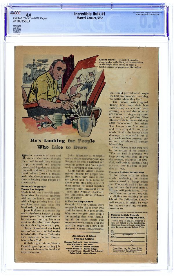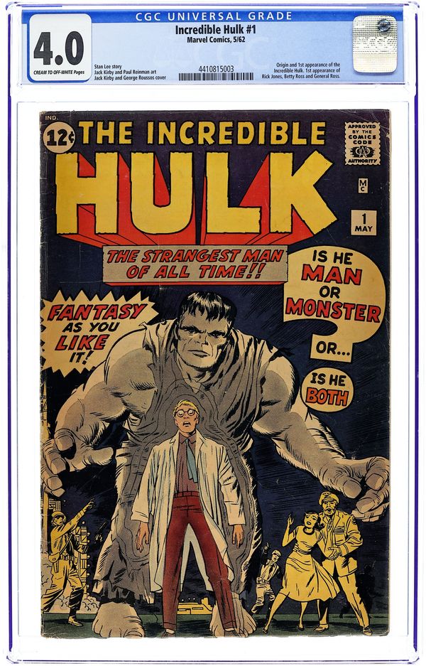 Ended Jul 16 2025 Bid History 51 bids Winning Bid $17,500 The first appearance and origin of the Incredible Hulk in "The Coming of the Hulk." Script by Stan Lee, pencils by Jack Kirby, inks by Paul Reinman. 1st app. Rick Jones, General Ross, and Betty Ross. It's the height of the Cold War and the government is about to test their new Gamma Bomb. Unfortunately, a carefree and oblivious teenager named Rick Jones wanders out onto the test area. Dr. Bruce Banner, the creator of the Gamma Bomb, rushes out to warn the young man away. However, the bomb explodes and as Banner pushes the teenager to safety he is caught in the heart of a Gamma maelstrom. The gamma-rays that bombard Banner's thin frame transform his physiology. Now, whenever Banner becomes angry he transforms into the man-brute known as the Incredible Hulk. Feared by the public and hunted by the army, the Hulk becomes one of the most tragic figures in Marvel's history. General "Thunderbolt" Ross will not rest until the Hulk is destroyed. The creature's only allies are Rick Jones and Betty Ross, Thunderbolt's daughter and Banner's one true love. Thus begins the epic saga of the world's mightiest mortal. NOTE: Notice that the Hulk was colored grey for the first few issues of his series. In an interview, Stan Lee (creator) said very simply that the reason for this was that grey was the easiest color for the copiers of the time to print. When the technology got better the Hulk became green, and according to Stan, for no better reason than they didn't have a green hero in their stable yet. 36 pgs. Cover price $0.12. Grade: CGC 4.0 explanation of grade Condition: Used (collectible)