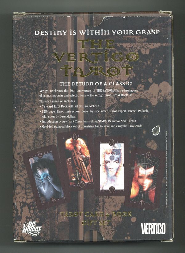 Ended Sep 24 2024 Winning Bid $31 Guide book Written by Rachel Pollack with Introduction by Neil Gaiman. Artwork on cards by Dave McKean. What does YOUR future hold? Find out with the re-release of one of the most-requested and sought-after VERTIGO products of all time: The VERTIGO TAROT DECK SET, in a special gold foil-stamped Sandman 20th Anniversary Edition! With evocative card images and illustrations by award-winning artist Dave McKean, the 78 tarot cards in the set are designed to be utilized by any practitioner of tarot. The Major Arcana of the set features an array of Vertigo characters, including: * The Fool - John Constantine. * The Magician - Tim Hunter. * The High Priestess - Titania, Queen of Faerie. * The Hierophan - Morpheus. * The Wheel of Fortune - Destiny of the Endless. * Death - Death of the Endless. * The Devil - Lucifer. * The World - Swamp Thing. This new anniversary edition features: Seventy-eight cards with art by Dave McKean, a softcover 128-page book (with a four-color cover by McKean, black and white interior text by tarot expert Rachel Pollack, and an introduction by New York Times best-selling SANDMAN author Neil Gaiman), plus a black velvet-like drawstring bag to hold the tarot cards. The book cover, box front, spines and velvet-quality bag are gold foil-stamped with a special Sandman 20th Anniversary logo. Cover price $39.99. Grade: FN 6.0 explanation of grade Condition: Used (collectible)