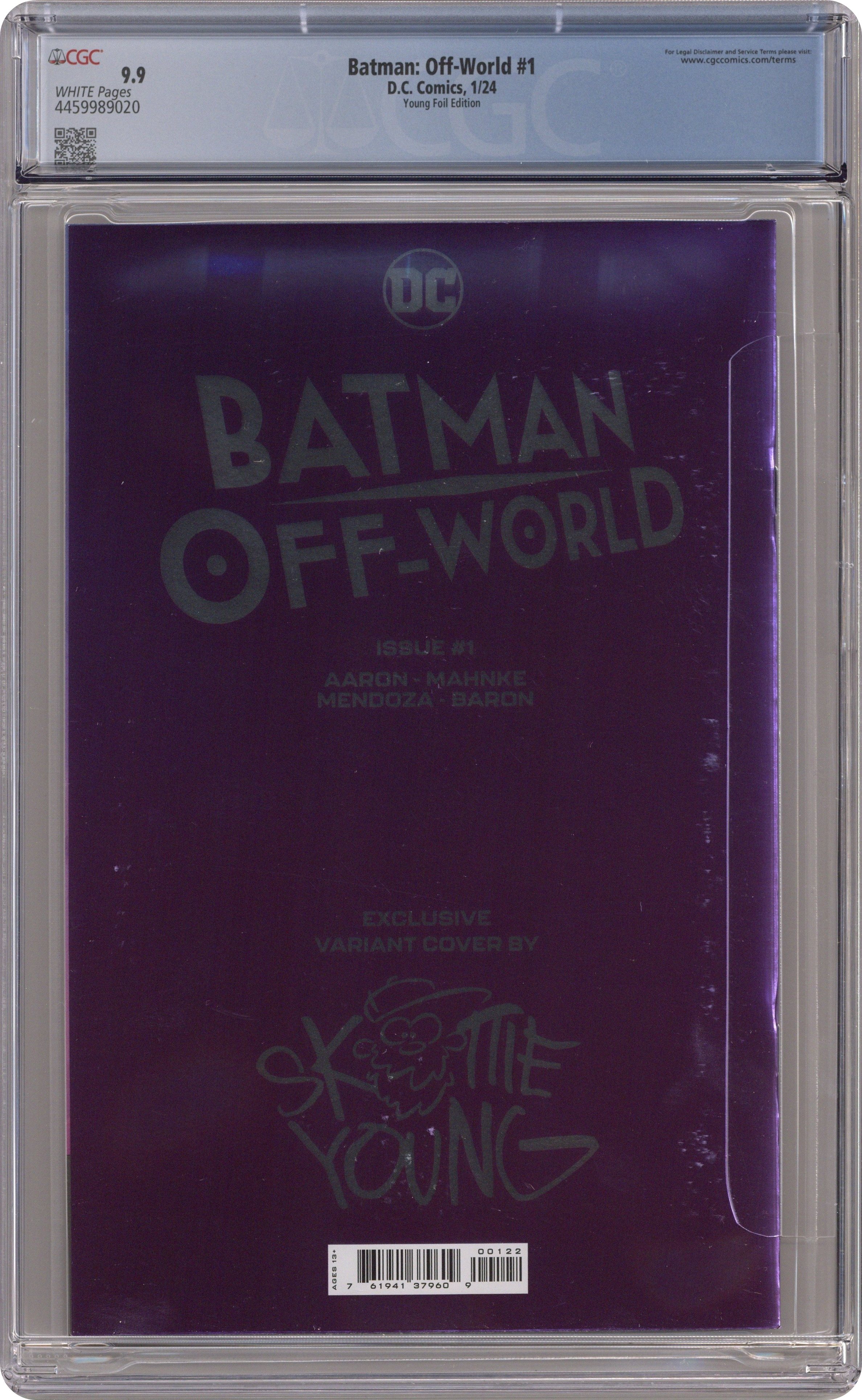 Ended Oct 18 2024 Winning Bid $146 Webstore Exclusive Foil Edition Virgin Cover by Skottie Young. Written by Jason Aaron. Art by Doug Mahnke. A routine night in Gotham City for a young Batman proves to be anything but routine when the crime-fighter is confronted with a sort of foe he's never faced before--one from beyond the stars! A universe of possible alien threats leads Batman to make a daring decision--to venture alone into the far reaches of the cosmos for the very first time, where the Dark Knight will face the fight of his life! Superstar writer Jason Aaron delivers his first Batman story ever, partnered with blockbuster artist Doug Mahnke for a unique, brutal tale! 32 pages, full color. Rated T+ Grade: CGC 9.9 explanation of grade Condition: Used (collectible) unless item is a new release
