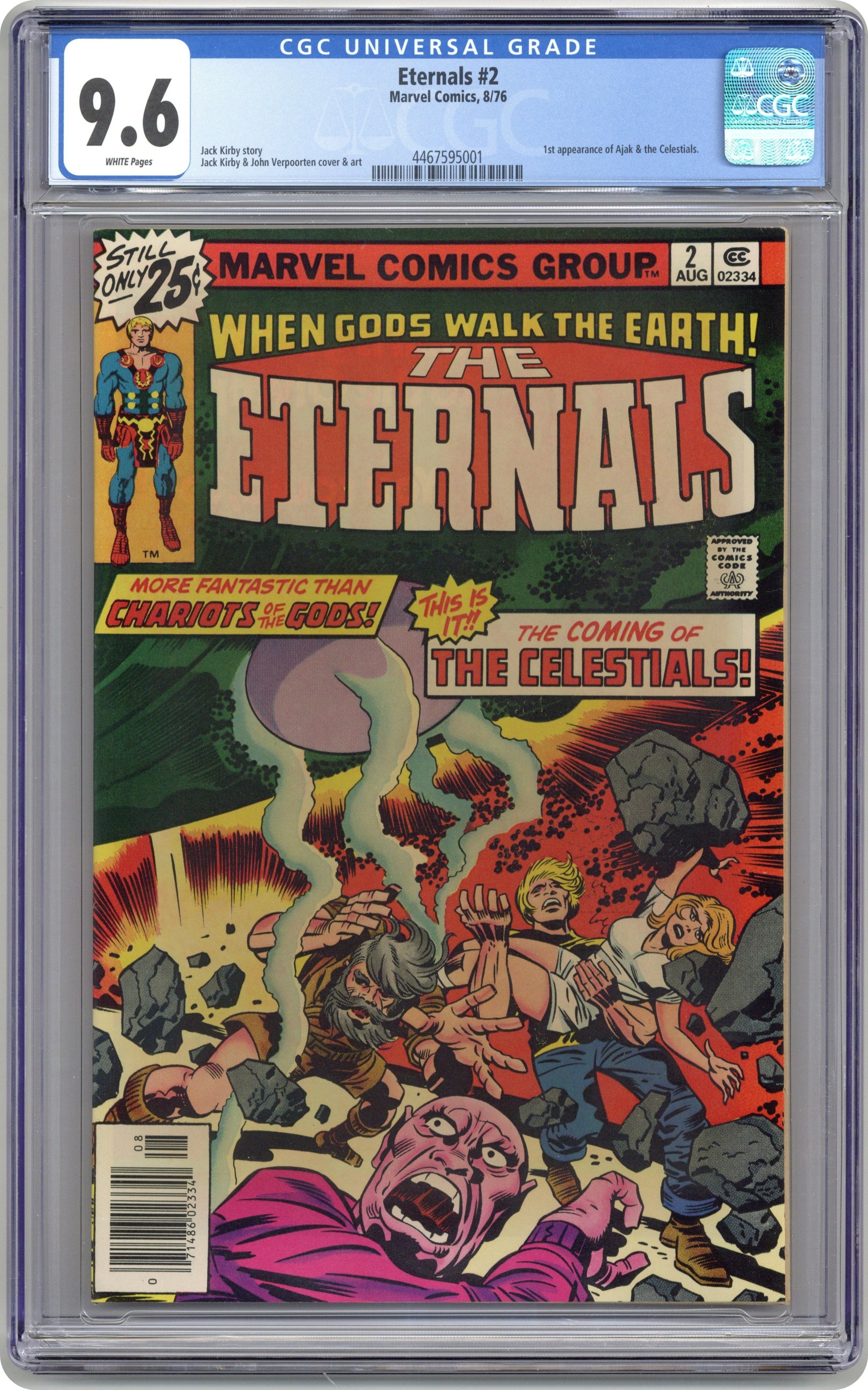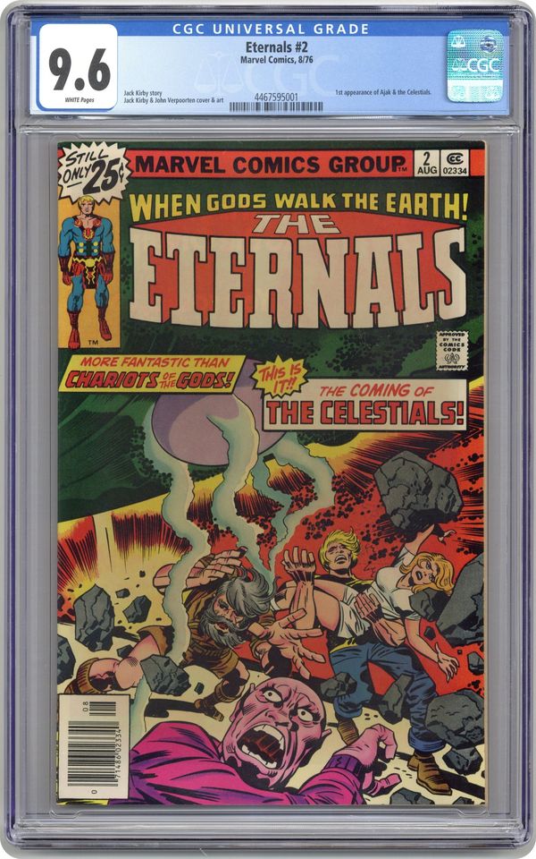 Ended Oct 23 2024 Winning Bid $36 "The Celestials!" Written by Jack Kirby. Pencils by Jack Kirby. Inks by John Verpoorten. The gods are real and they live among us! Archeologist Doctor Damian and his daughter Margo, led by the enigmatic Ikaris, soon learn that they are not alone in this universe. But could the return of the space gods known as the Celestials possibly mean. Note: 1st appearance of Ajak and the Celestial Arishem the Judge. Cover price $0.25. Grade: CGC 9.6 explanation of grade Condition: Used (collectible)