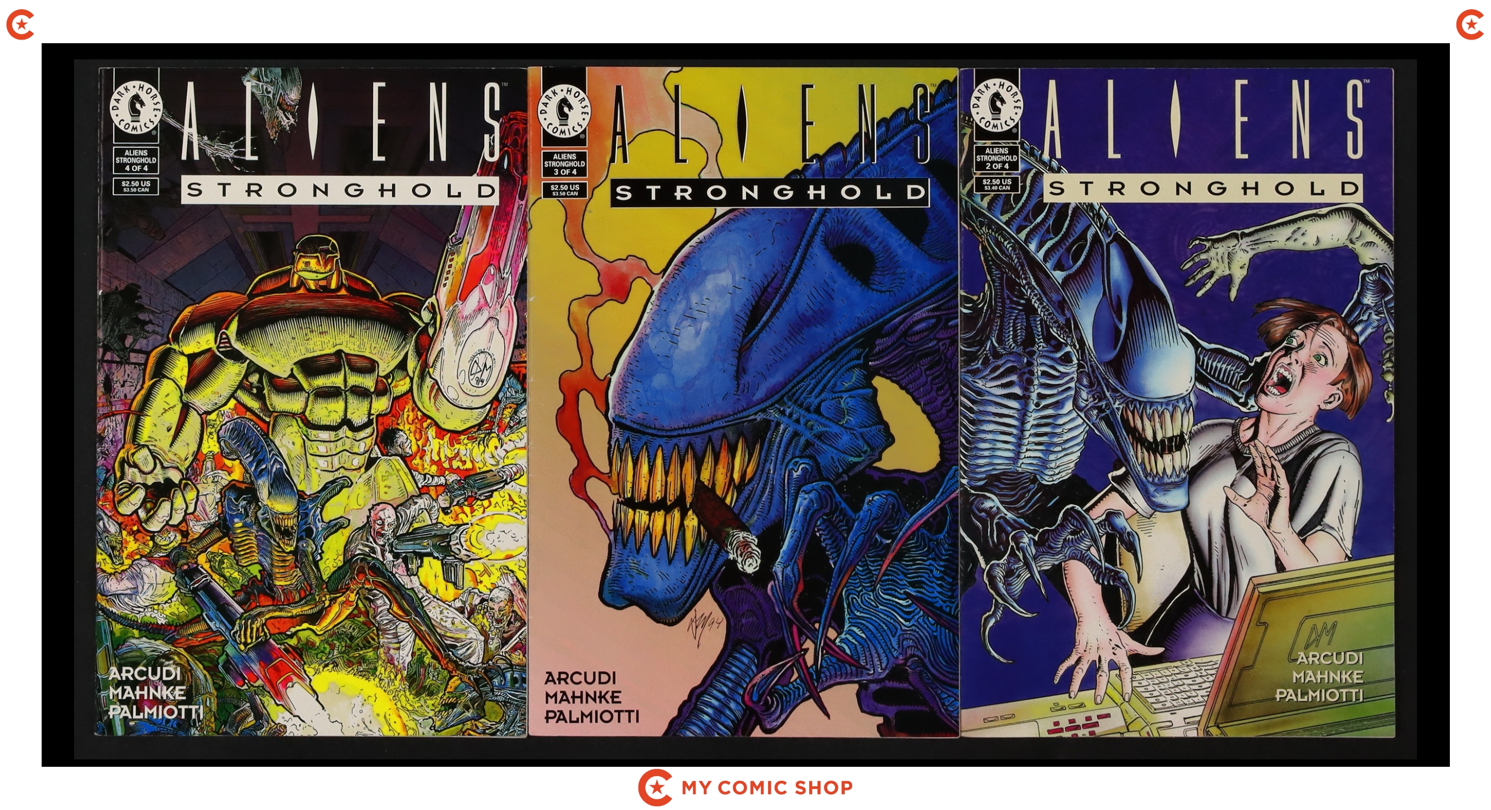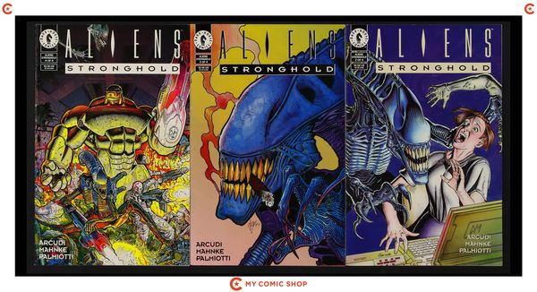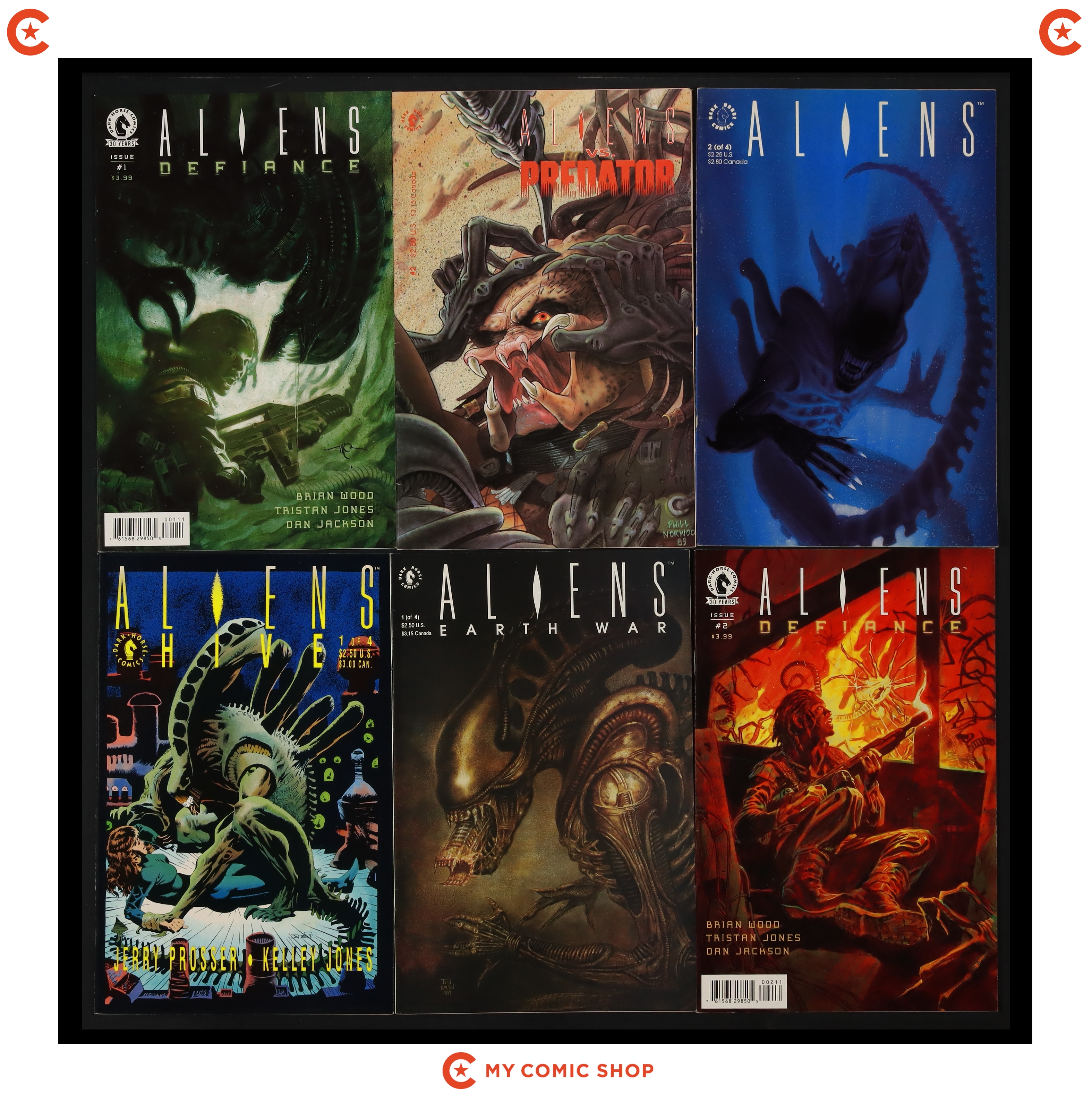 Issues 2 of Aliens (1989 Dark Horse); 2 of Aliens vs. Predator (1990); 1A and 2 of Aliens Defiance (2016 Dark Horse); 1 of Aliens Earth War (1990); 1 of Aliens Hive (1992); and 2-4 of Aliens Stronghold (1994). Most will grade in the FN range.