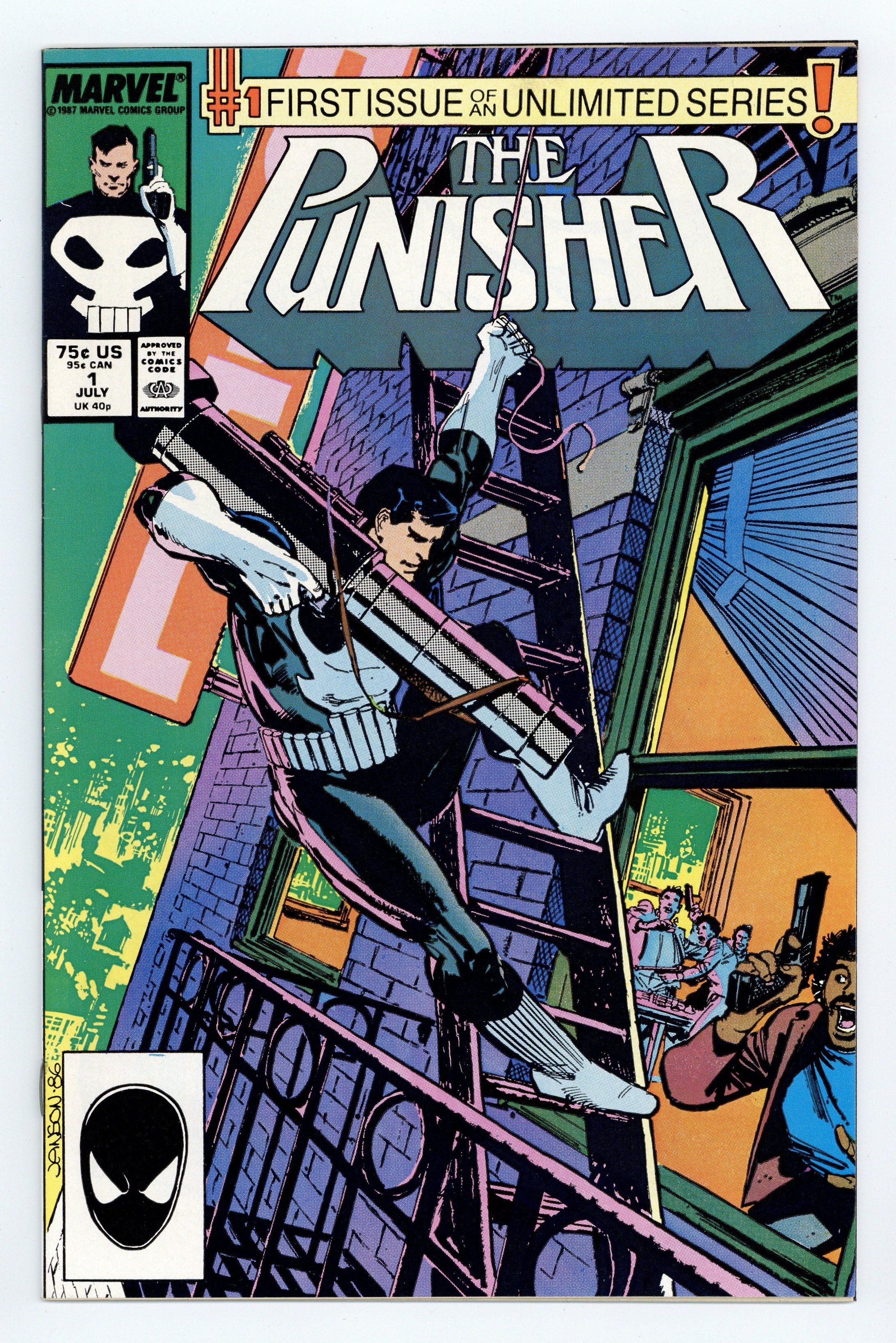 Starts Feb 9 Direct Edition. Story by Mike Baron. Art by Klaus Janson. Vietnam vet Frank Castle's wife and children were caught in the crossfire of warring crime families. Now, he's back and they're all going to pay. All of them. Those that visit harm on others will come to know him as the Punisher. Frank starts up his first ongoing series with guns blazing. His first target, a drug dealer who thinks he's above the law. Well, he's not above Punishment. Cover price $0.75. Grade: VF+ 8.5 explanation of grade Condition: Used (collectible)