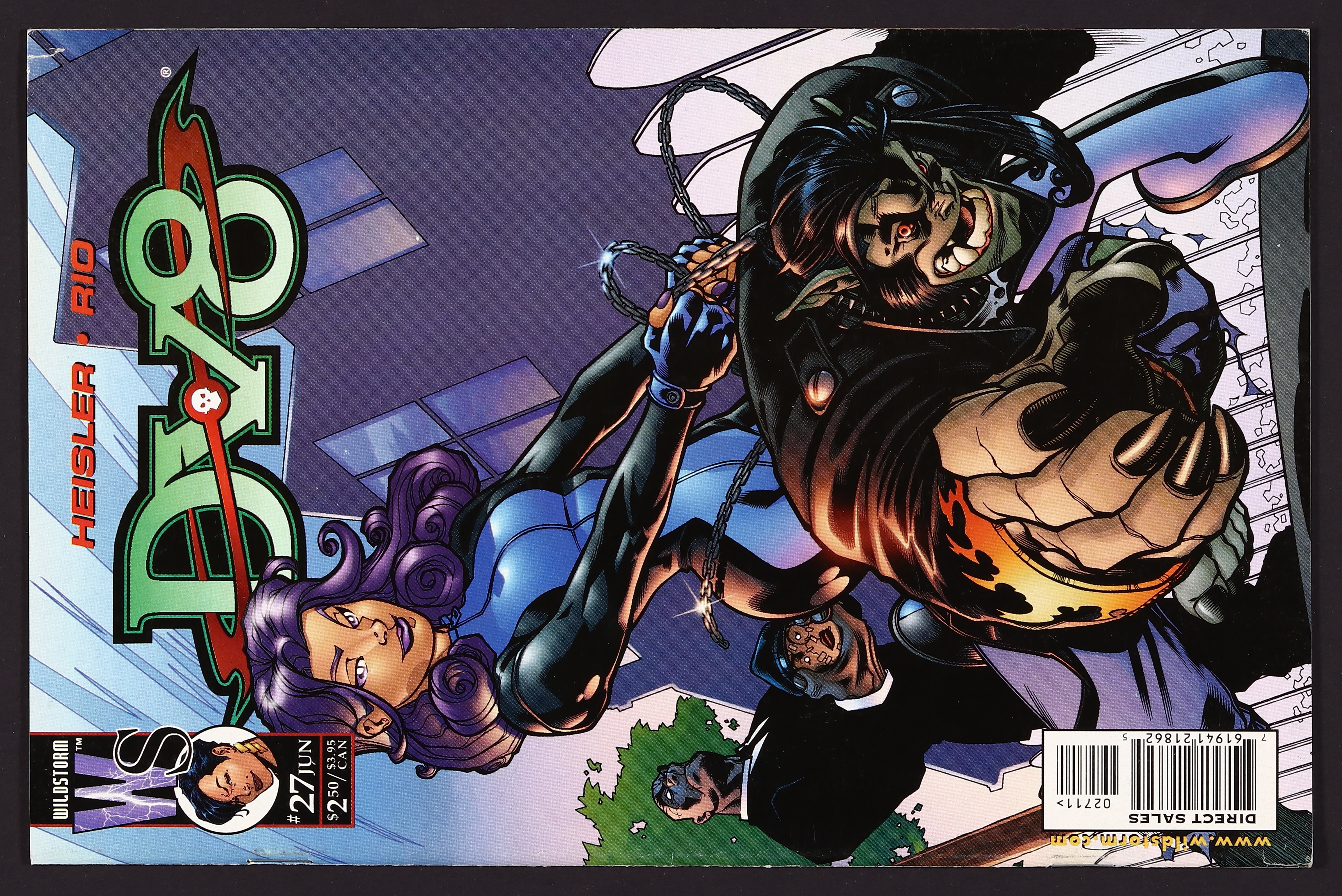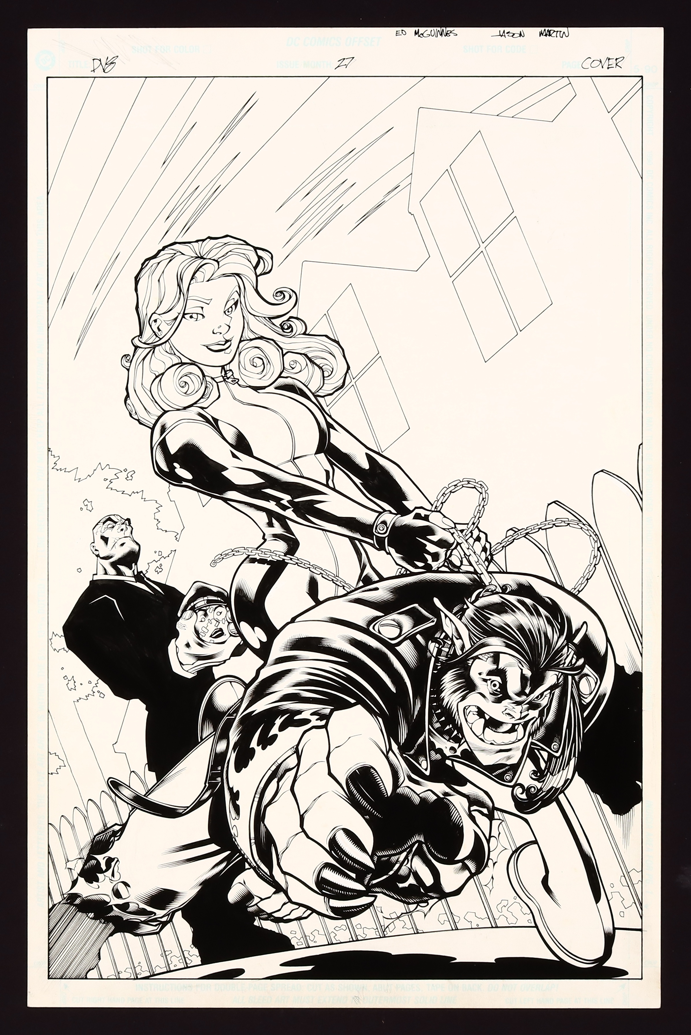 McGuinness' trademark style pops off the page on this fantastic cover that sees the morally dubious psychic Bliss taking the shape-shifting Evo for a little walk in an image that serves as a metaphor for the issue's story which sees her using Evo's frustration with the team's methods to her own ends. Also included is a copy of the published issue. Pencil and ink on DC Comics art board. 11" x 17".