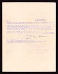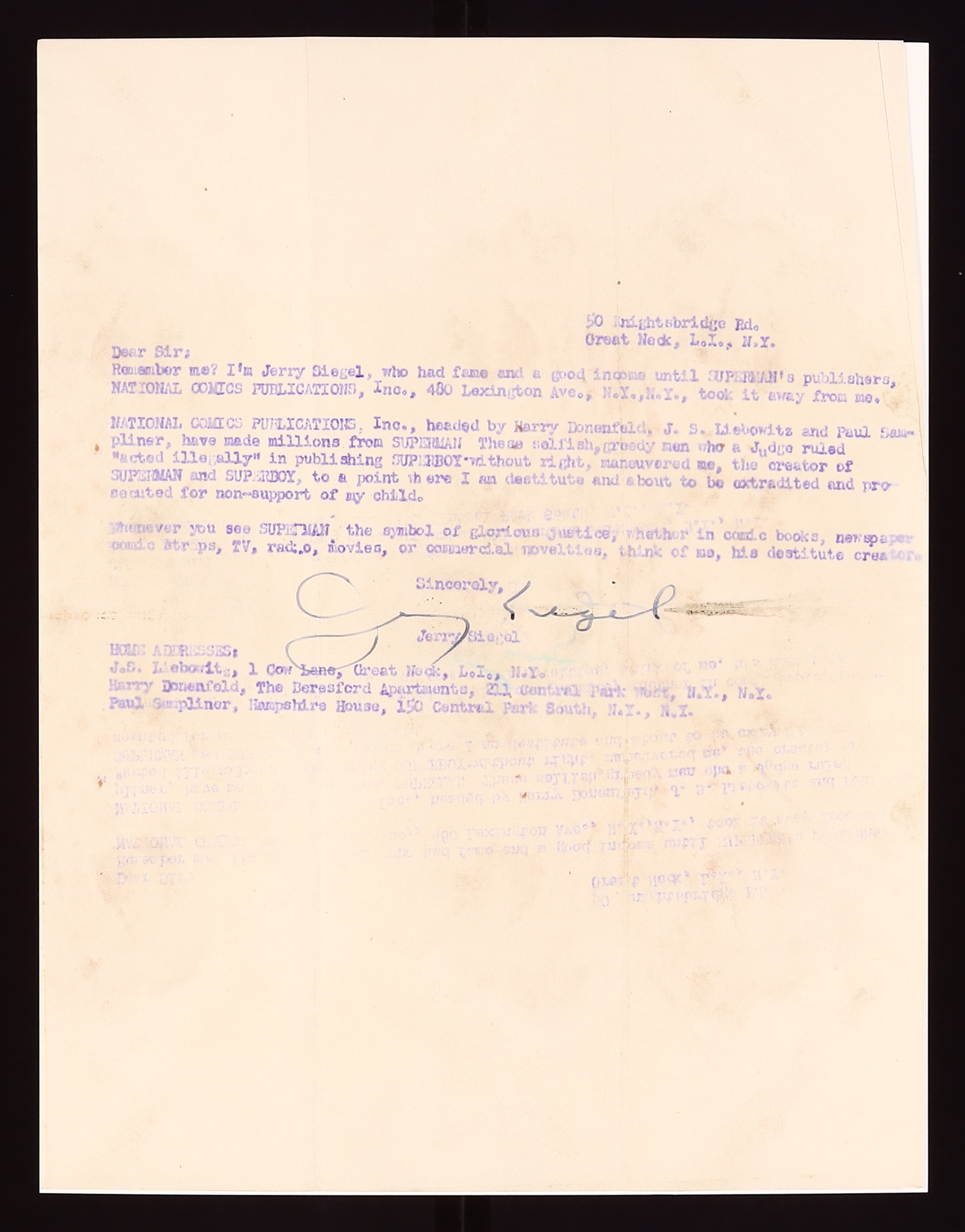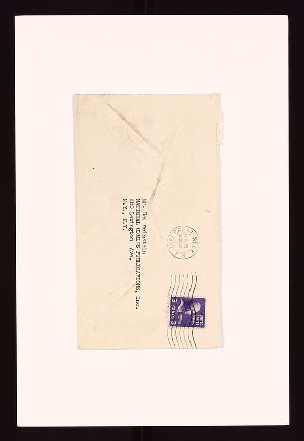 Another copy of this letter from Siegel sent to multiple National executives on the same date, though this one did not include any poems. Signed by Siegel. Also included is the original mailing envelope the letter was sent in. Letter is in fair condition with some staining. 8 1/2" x 11".