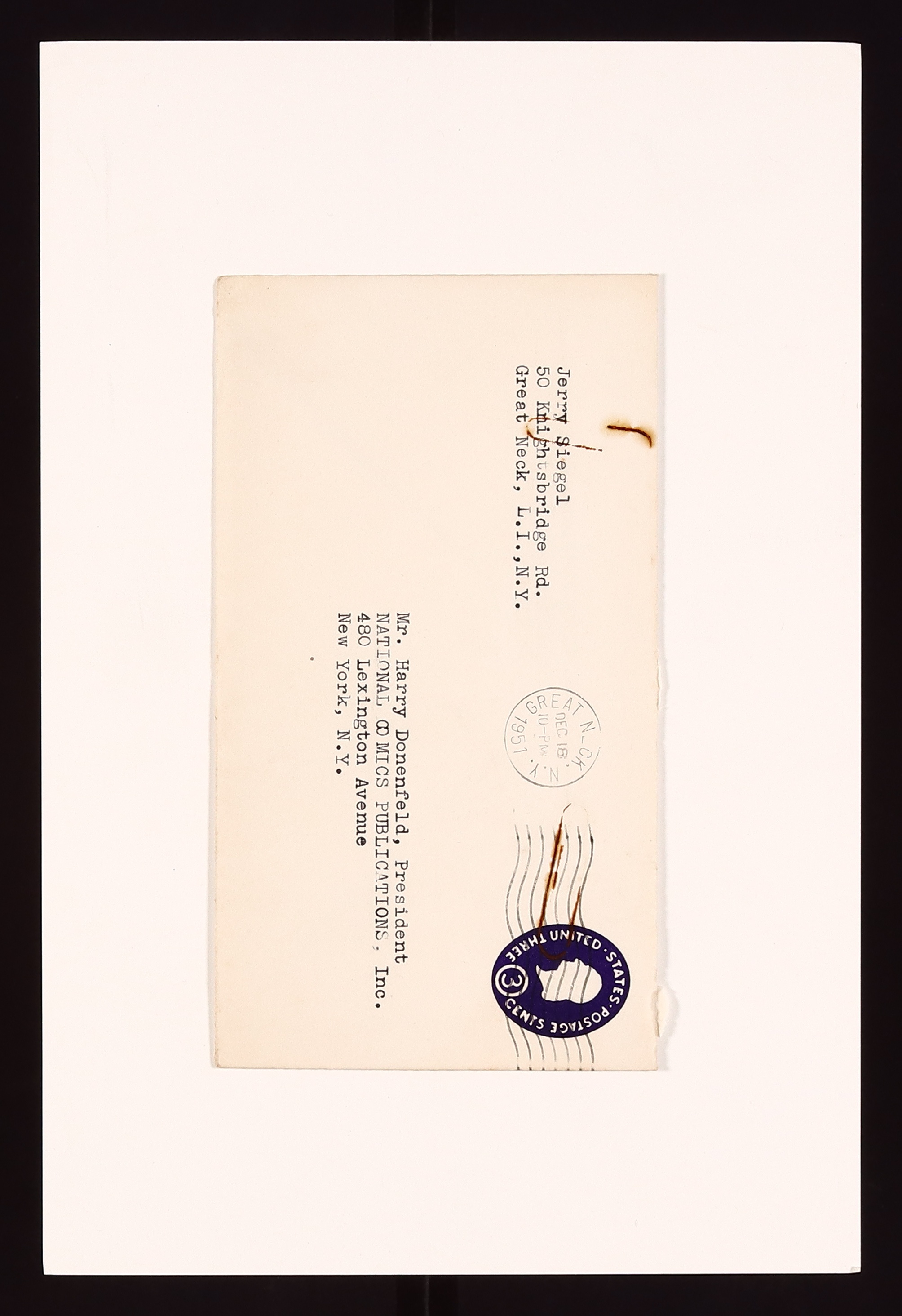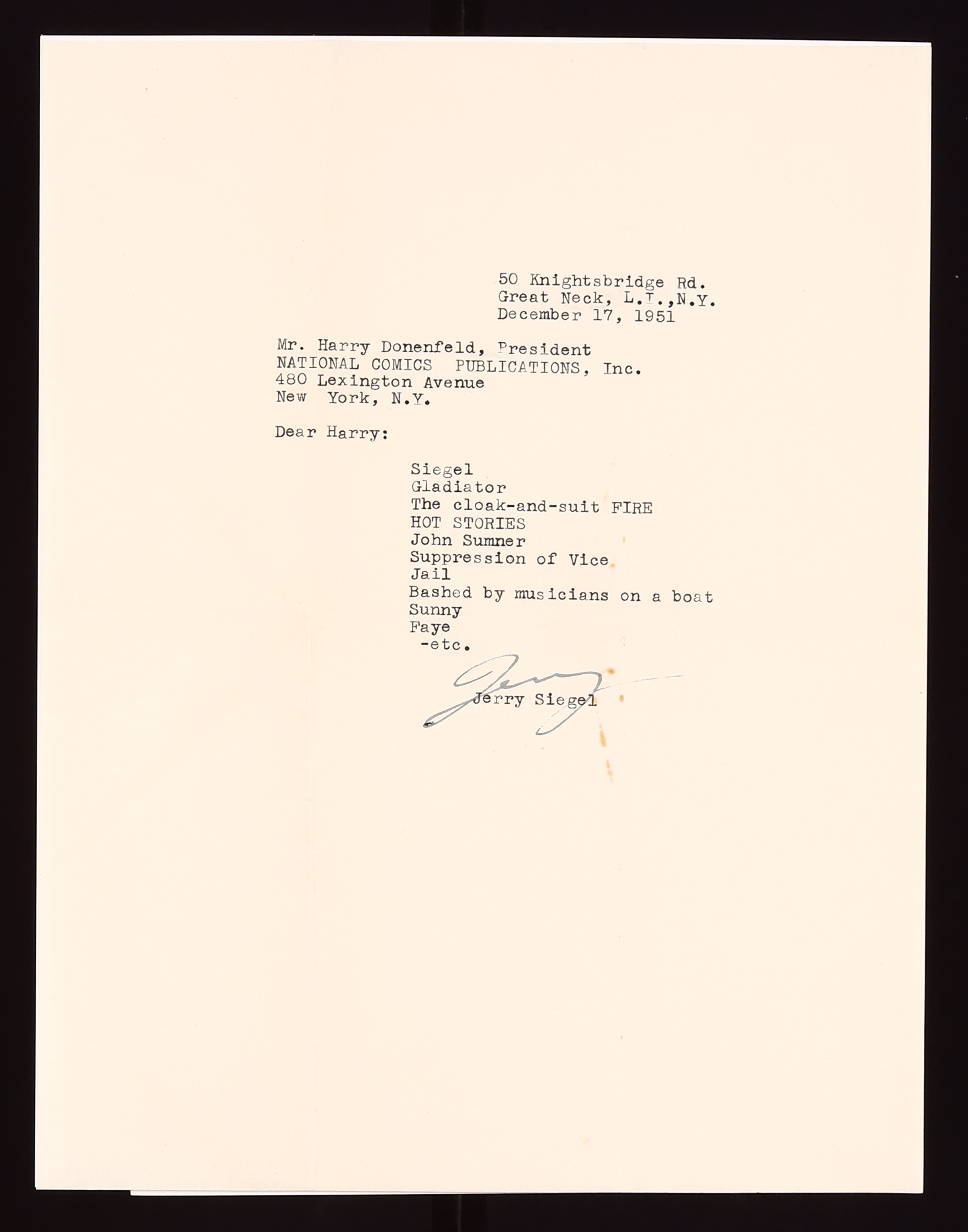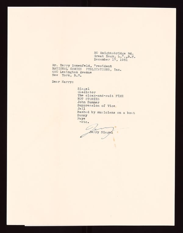 Probably the most cryptic of all the letters sent by Siegel in this war of words, this letter is just a list of references to people and events that Siegel is threatening to use as blackmail against Donenfeld and others. Most notable are "Siegel", "HOT STORIES", "John Sumner", "Suppression of Vice", and 'Jail"- all references to Donenfeld's past work with pulps and a an incident where a man named Herbert M. Siegel took the fall for an obscenity charge being levelled against Donenfeld in 1934. Signed by Siegel. Also included is the original mailing envelope the letter was sent in. Letter is in good condition with minor rust migration from a paperclip. 8 1/2" x 11".