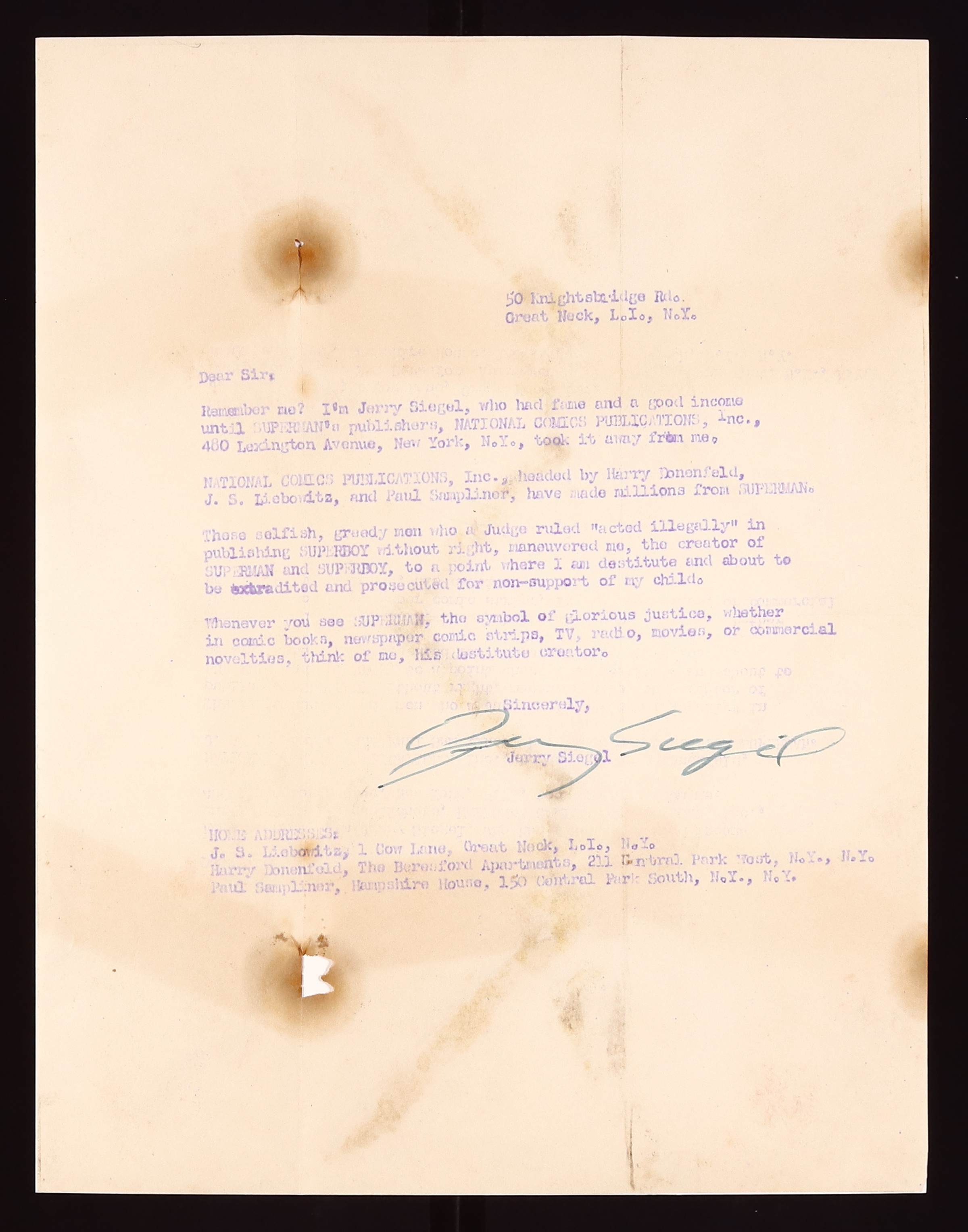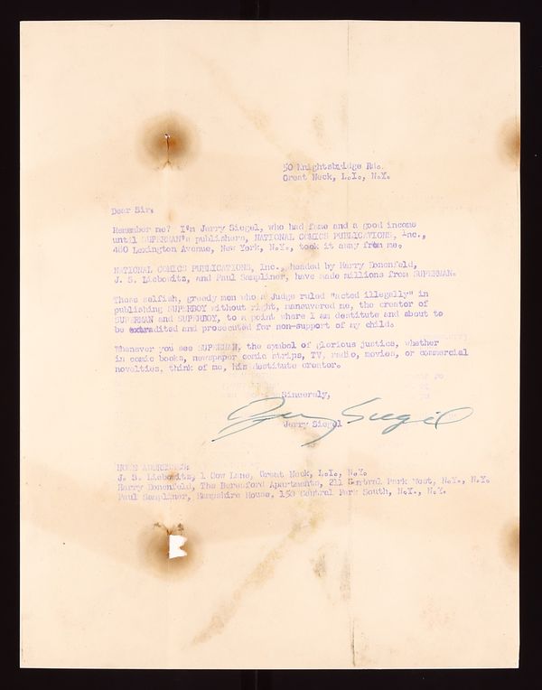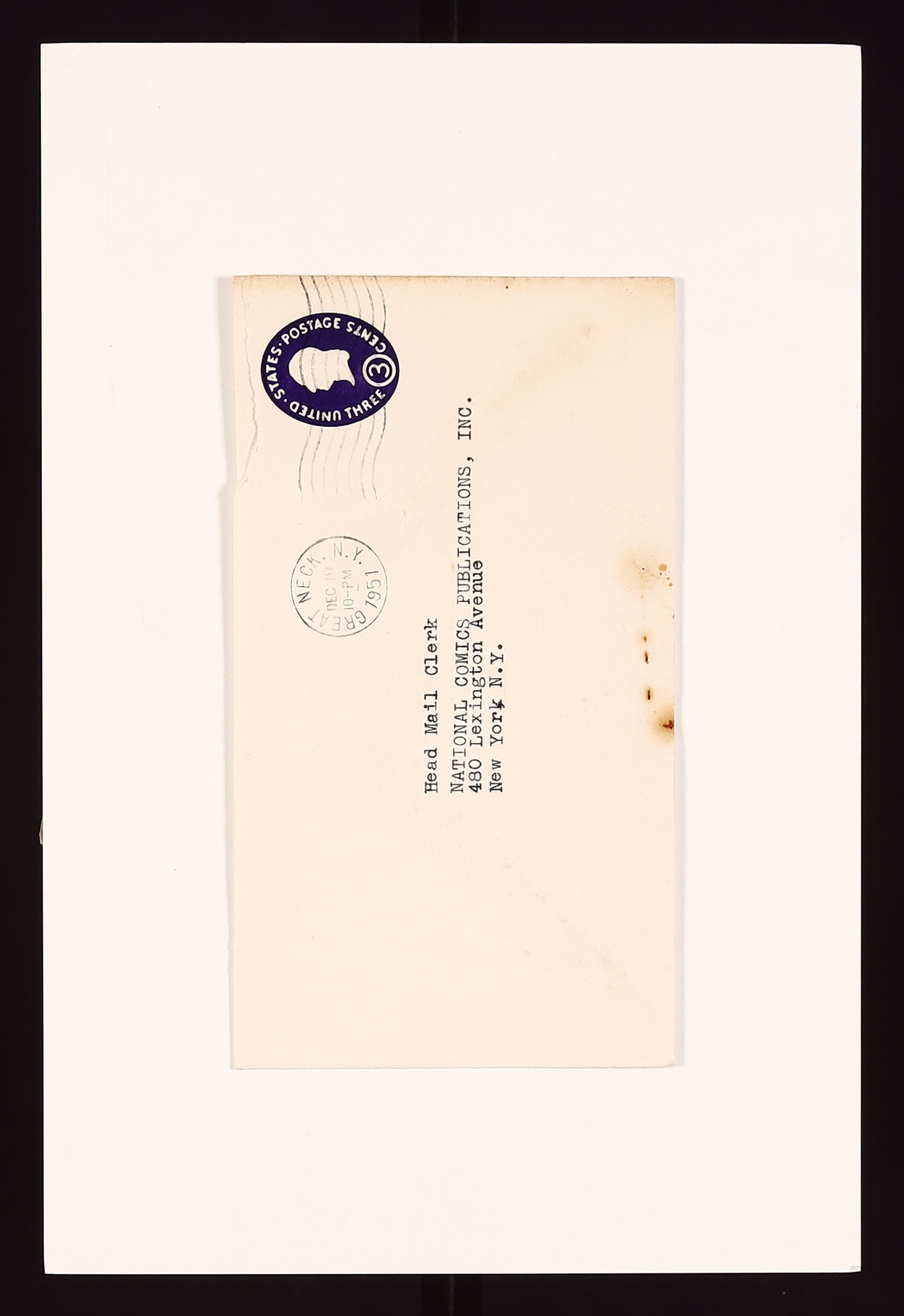 While this letter contains the same text as those sent to several National Comics executives, it is notable that a month after sending those out Siegel had gotten to a point where he was reaching out to the mail clerk. Letter displays significant damage including some paper loss due to oxidation at the fold points. Also included is the original mailing envelope the letter was sent in. 8 1/2" x 11".